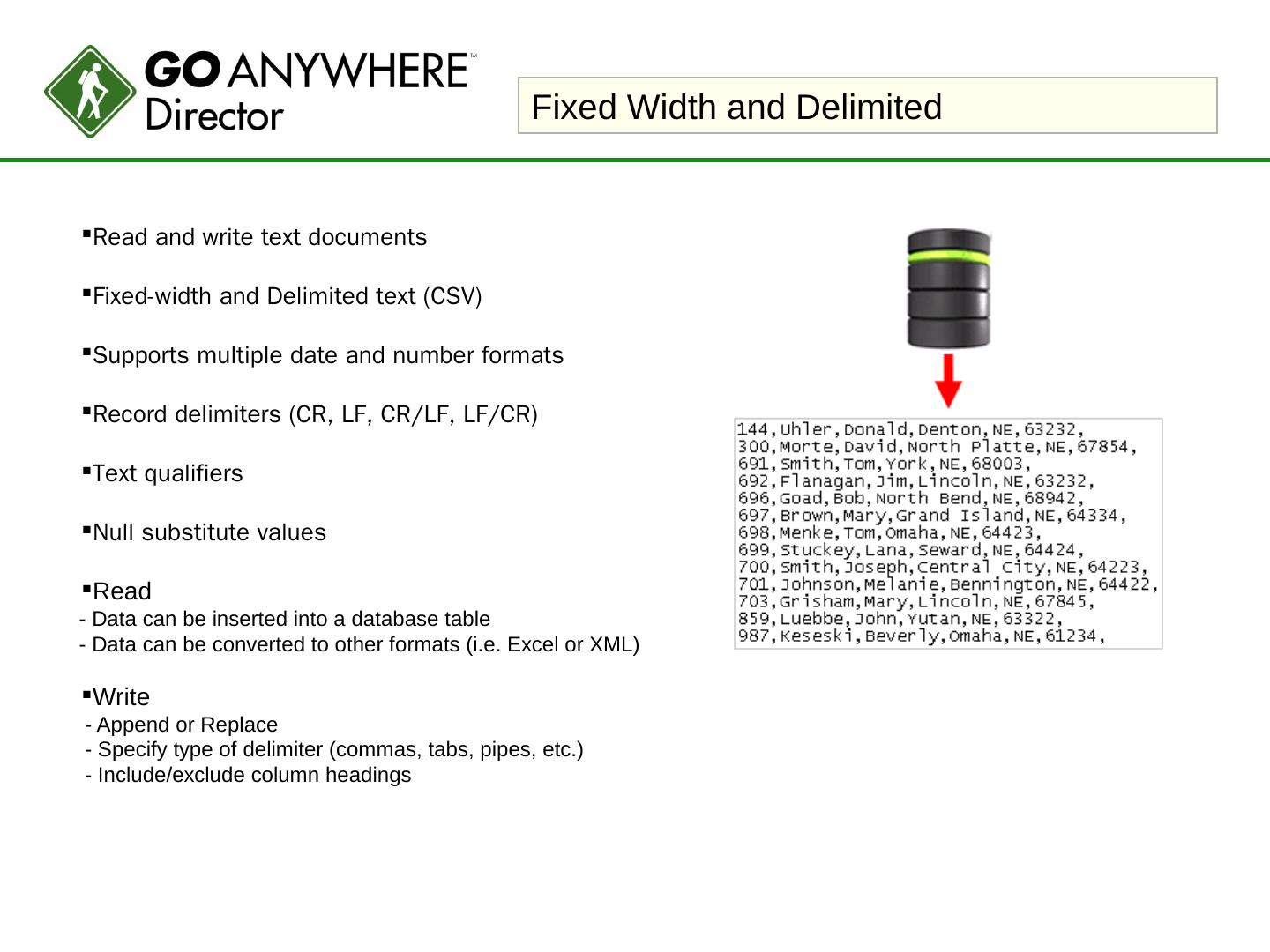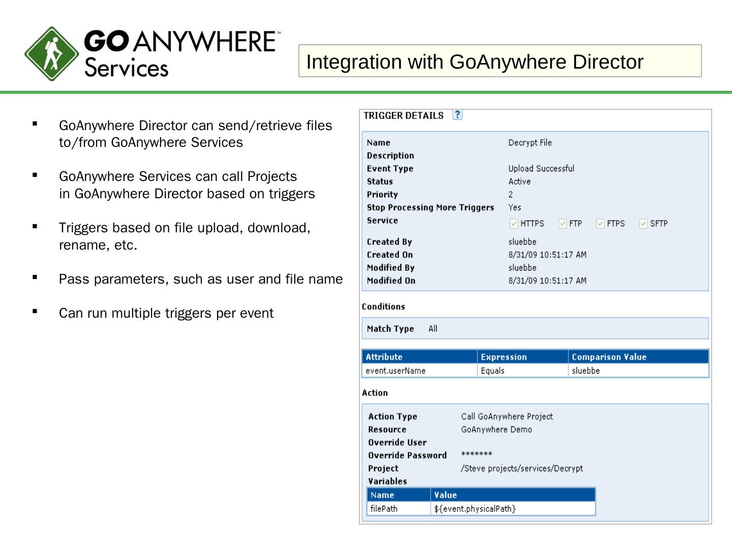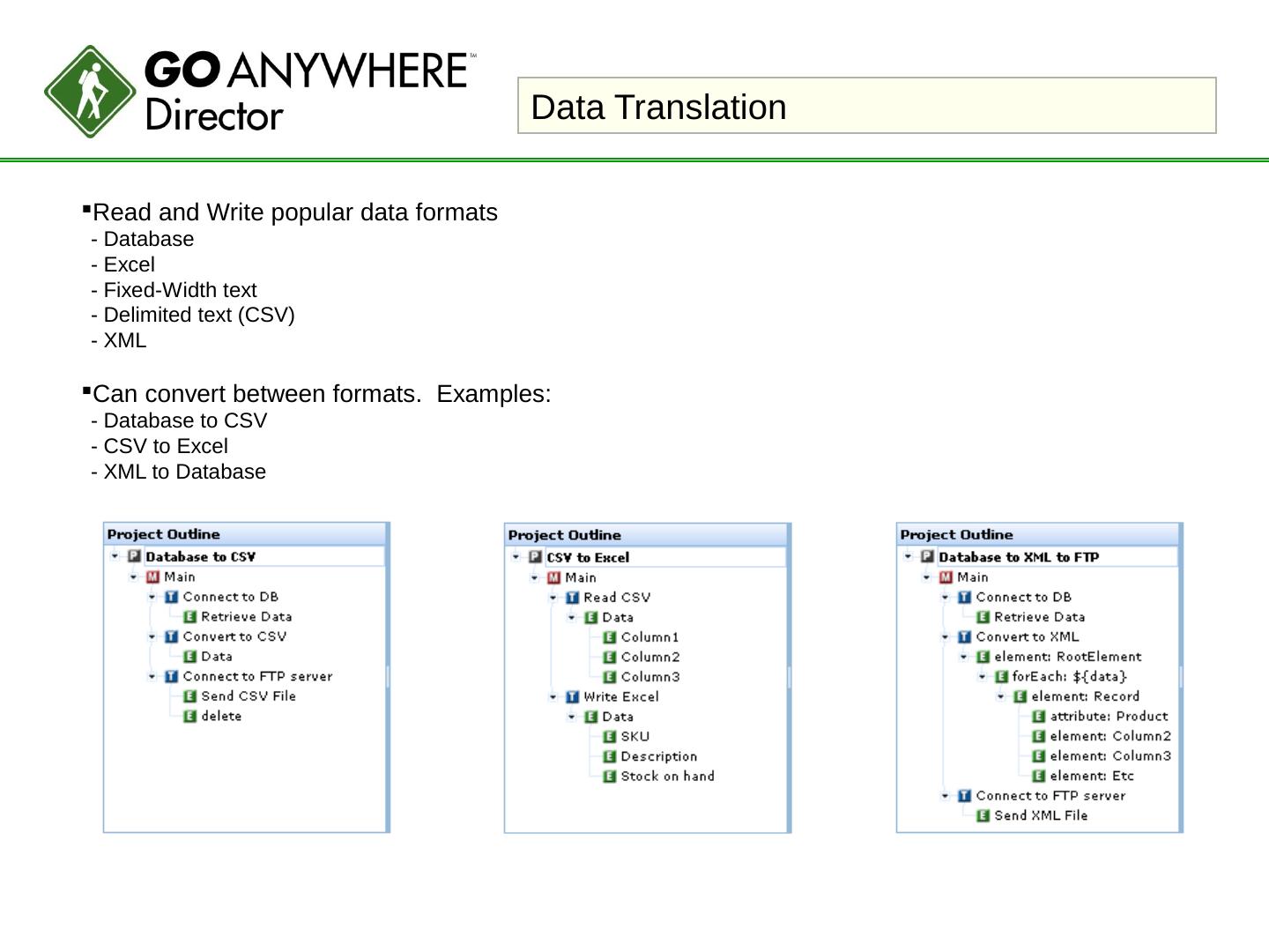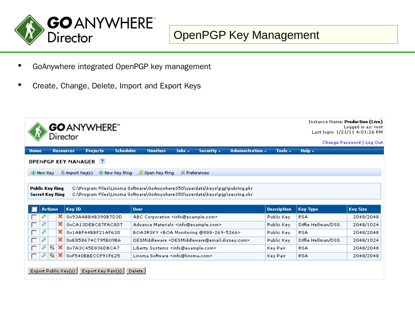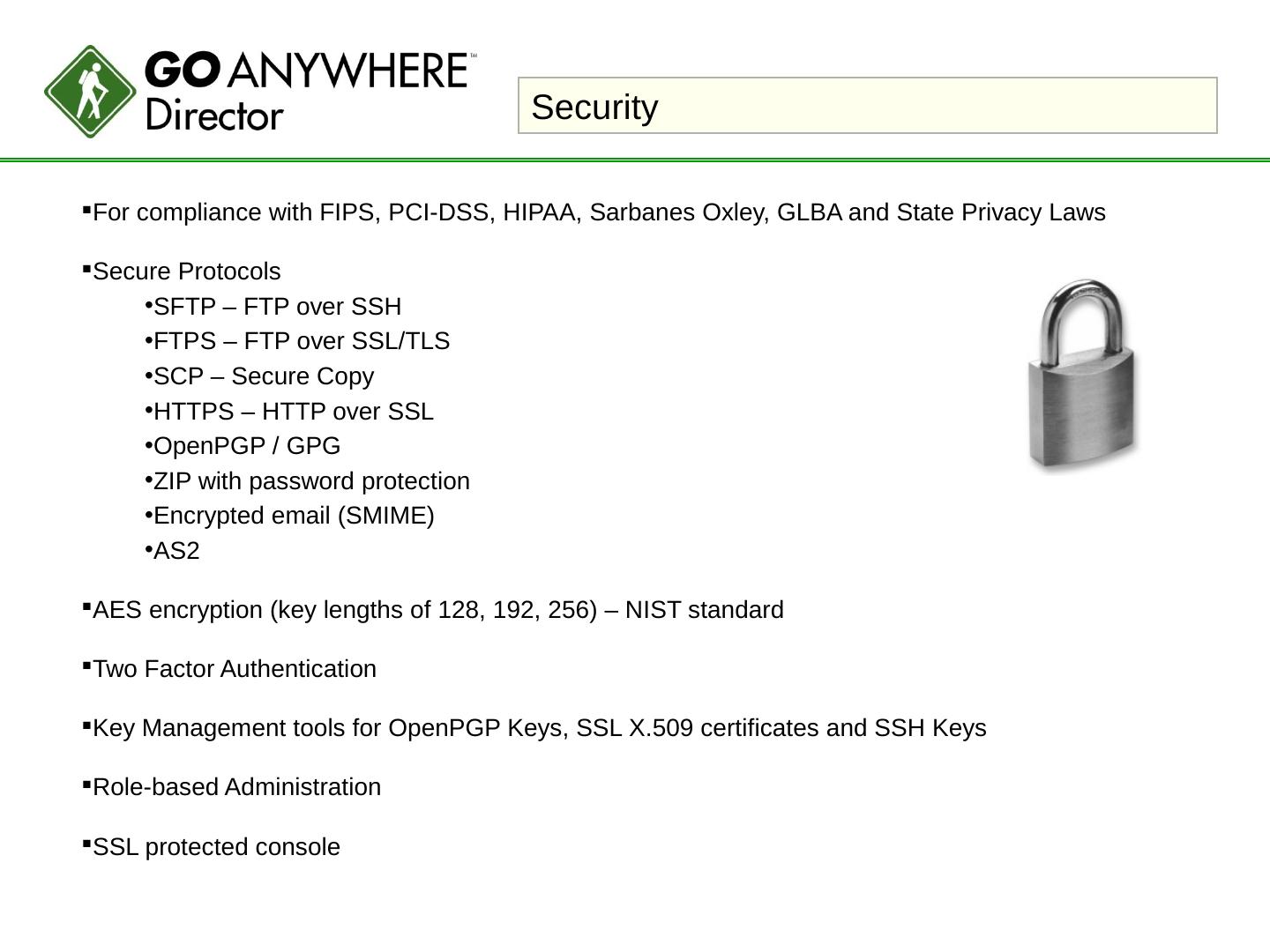 SFTP (FTP over SSH) - FTPS (FTP over SSL) - SCP (Secure Copy); Web Sites - HTTP - HTTPS (HTTP over SSL) - Web Services - AS2; Email - POP3 - IMAP