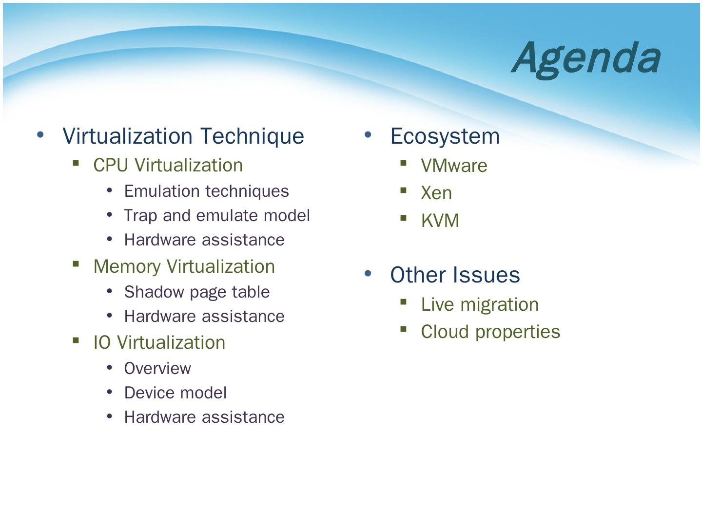 雲端計算. Cloud Computing. Server Virtualization. Agenda. Virtualization ..... For example, network card use DMA operation to load data into memory and ...