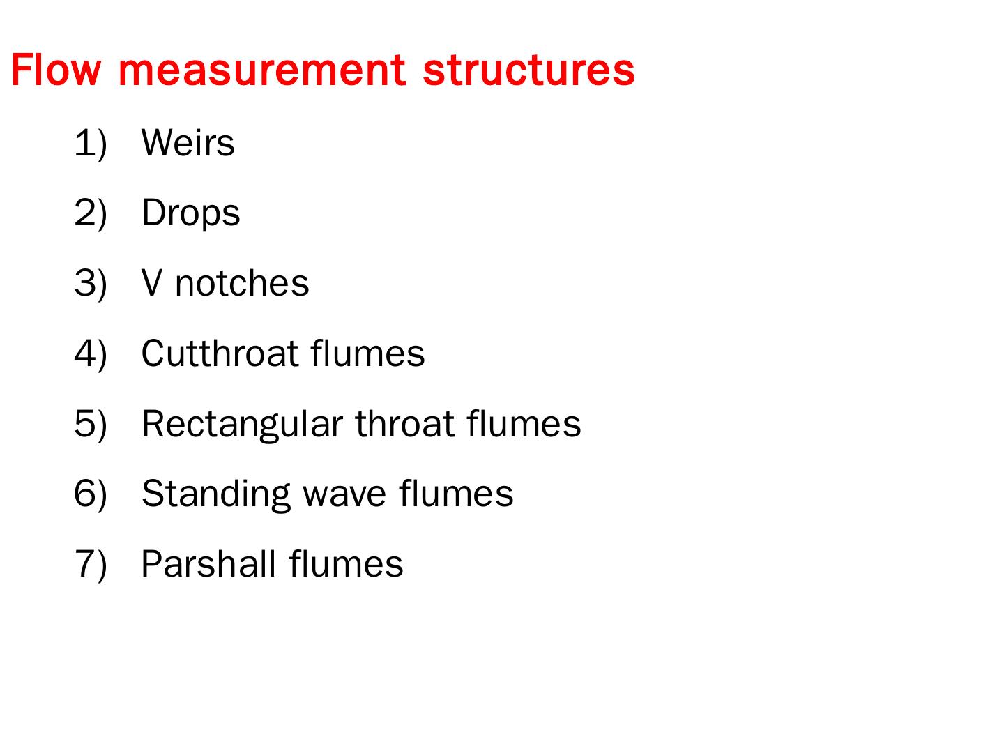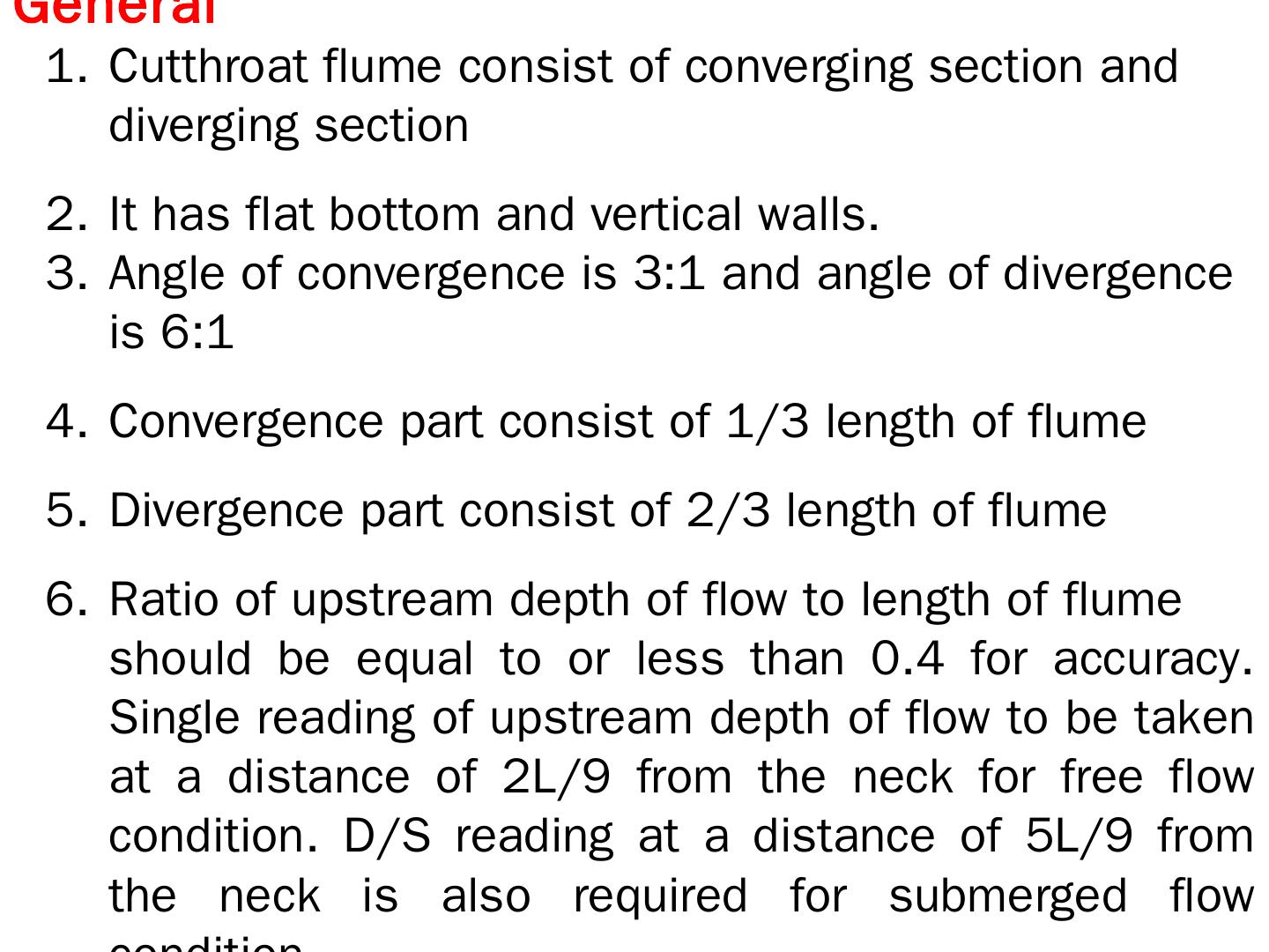 VENKATARAMAIAH. CUTTHROAT FLUME. Flow measurement structures. Weirs; Drops; V notches; Cutthroat flumes; Rectangular throat flumes; Standing wave ...