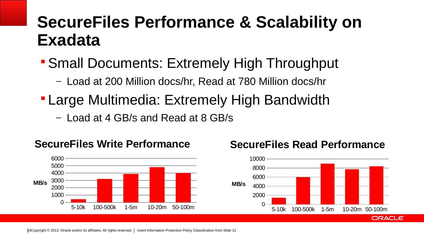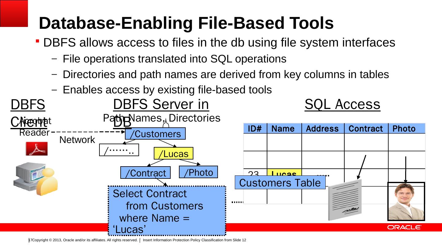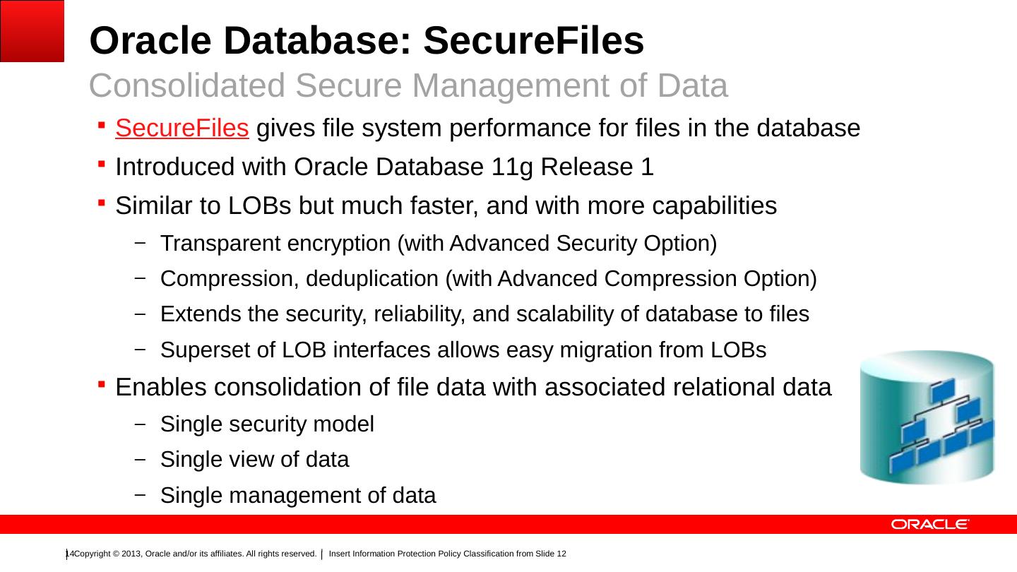 SecureFiles gives file system performance for files in the database; Introduced with Oracle Database 11g Release 1; Similar to LOBs but much faster, and with ...