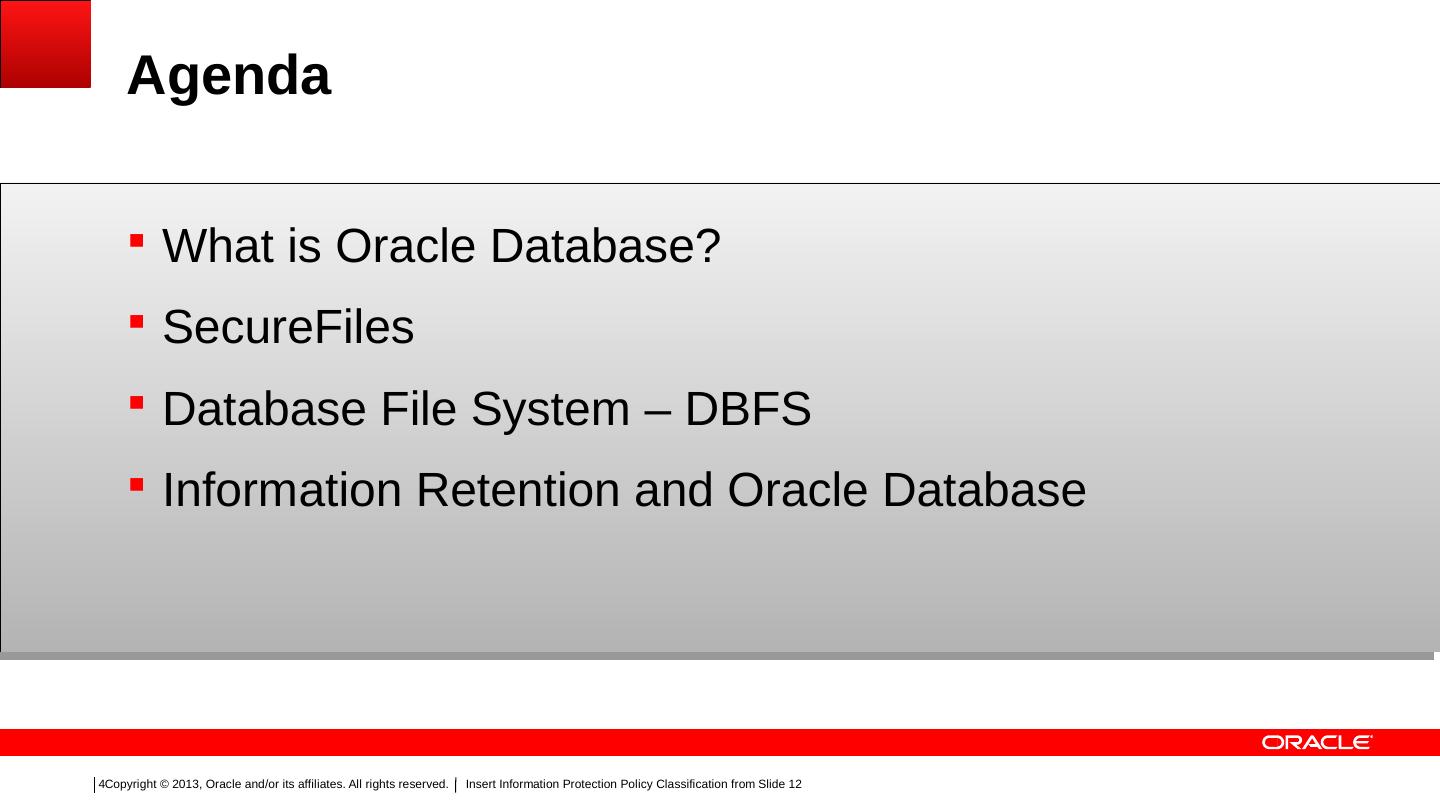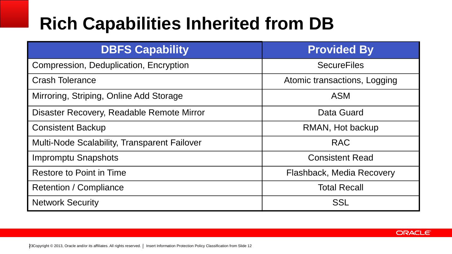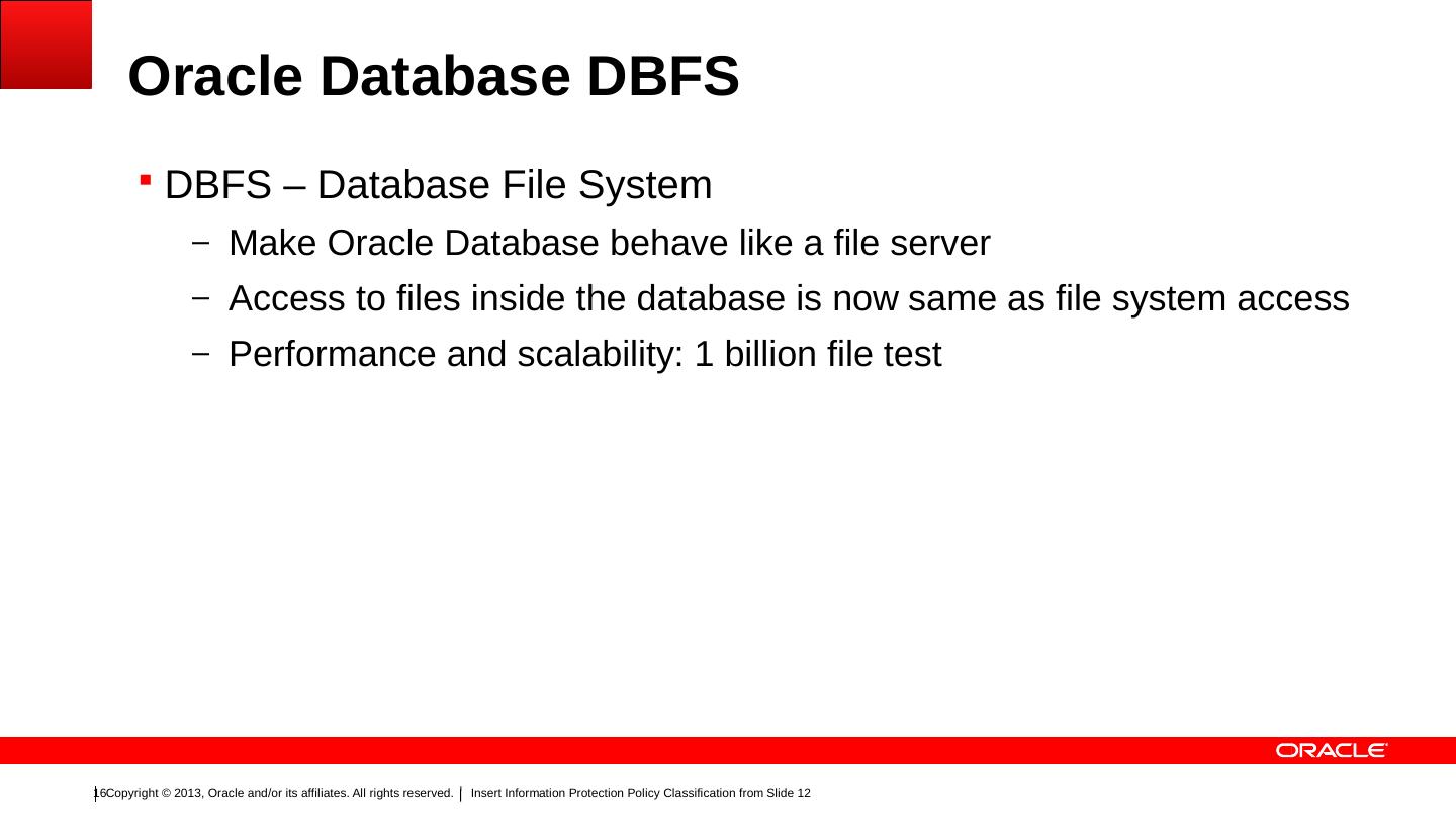 SecureFiles gives file system performance for files in the database; Introduced with Oracle Database 11g Release 1; Similar to LOBs but much faster, and with ...