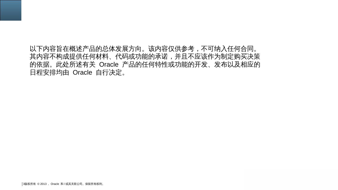 3 .以下内容旨在概述产品的总体发展方向 。 该内容仅供参考 ,不可纳入任何合同 。 其内容不构成提供任何材料、代码或功能的承诺,并且不应该作为制定购买决策的依据 。 此处所述有关 Oracle 产品的任何特性或功能的开发、发布以及相应的日程安排均由 Oracle 自行决定 。