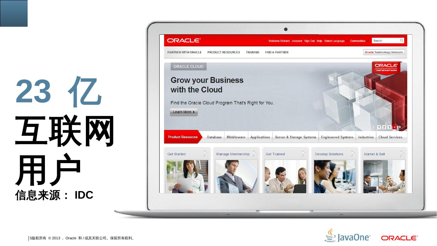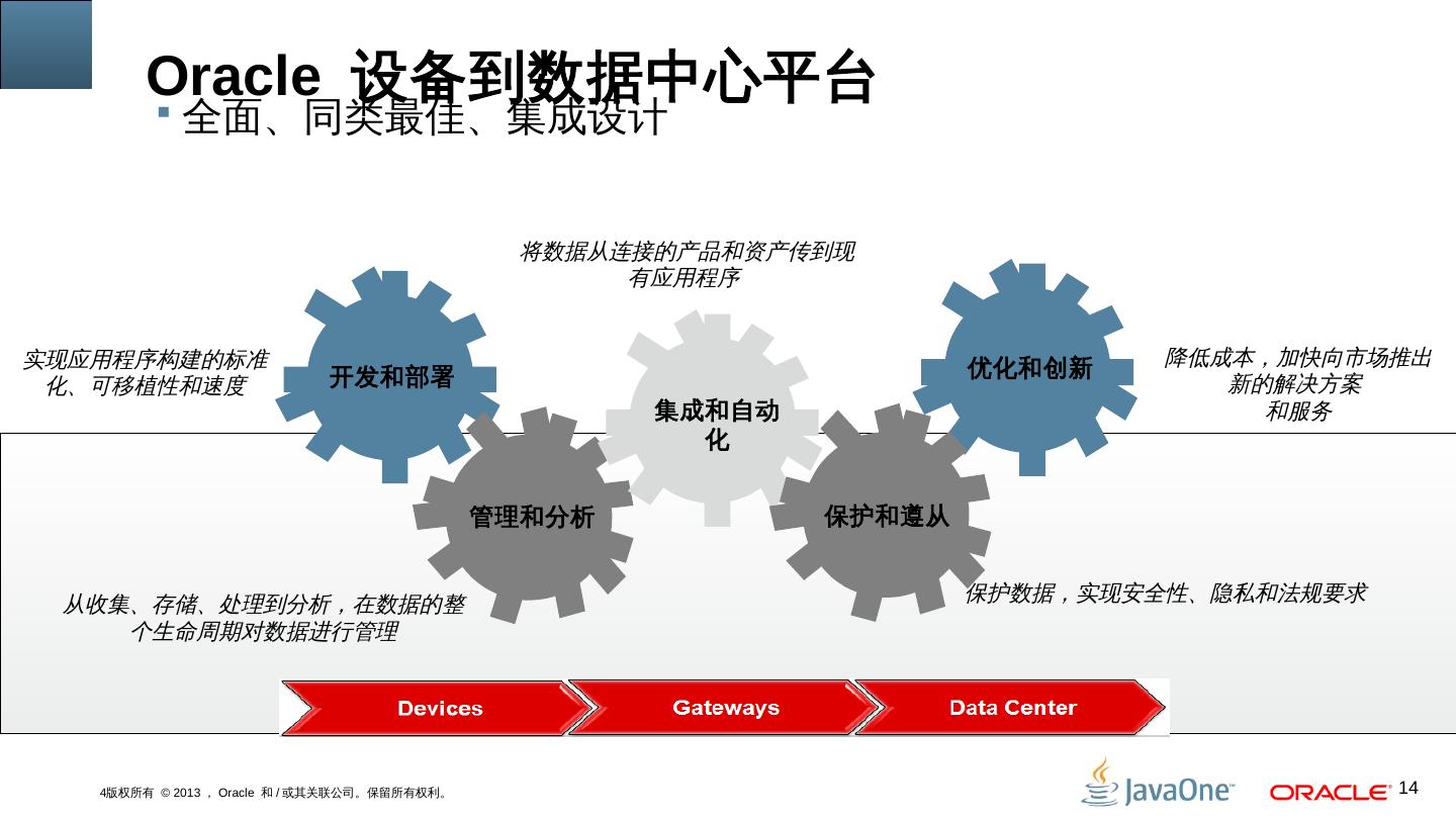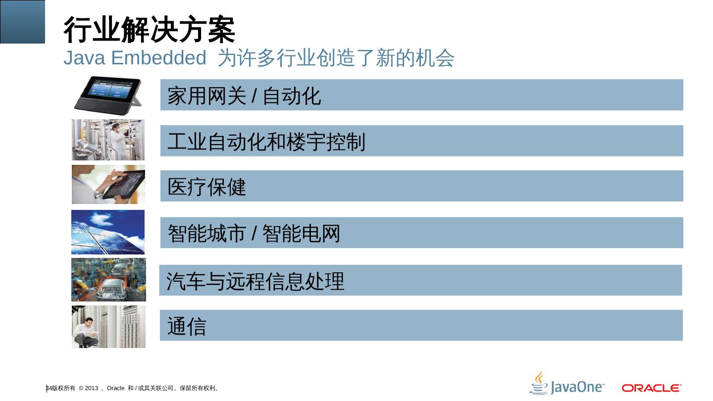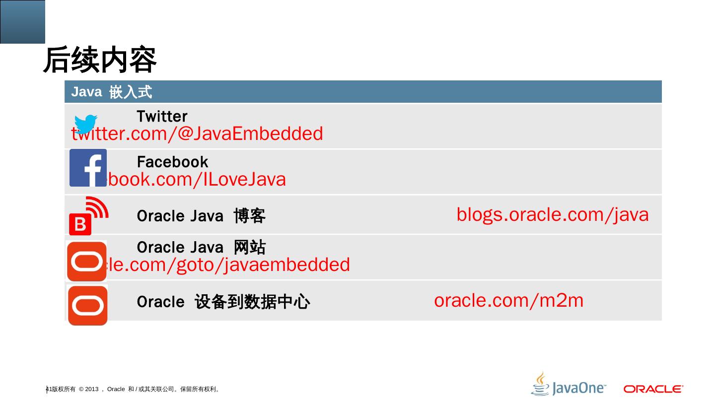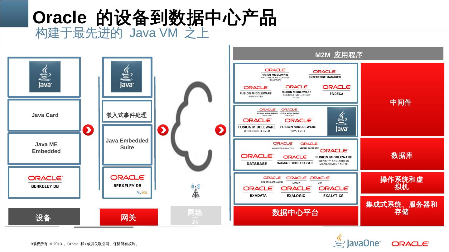 19 .Oracle 的设备到数据中心产品 设备 操作系统和虚拟机 所有设备均采用 Java 以通过使用与数据中心中所用相同的大众化技能提高开发速度和可靠性 使用 Oracle 中间件和数据库 软件作为基础构建 IP, 以实现更好的安全性、更好的支持和更好的服务质量 使用 Oracle 集成式系统 交付云服务和管理大数据 网络 云 中间件 设备 中间件 数据库 操作系统和虚拟机 集成式系统、 服务器和存储 集线器 或 网关 M2M 应用程序 XML、安全性、Web 服务、文件 I/O、消息传递、定位、 可嵌入式事务存储引擎,完全使用 Java 编写。带数据同步。 与在设备上一样,带有额外的事件处理和存储 与设备上一样 集成式存储、联网和处理、高可用性配置,支持控制。 数据加密、用户和设备身份供应以及访问 通过门户提供应用程序和信息板,支持: 在远程设备上 Java ME Embedded Java Card Java Embedded Suite 设备 网关 网络 云 数据中心平台 中间件 数据库 数据库 操作系统和虚拟机 集成式系统、服务器和存储 嵌入式事件处理 M2M 应用程序 构建于最先进的 Java VM 之上