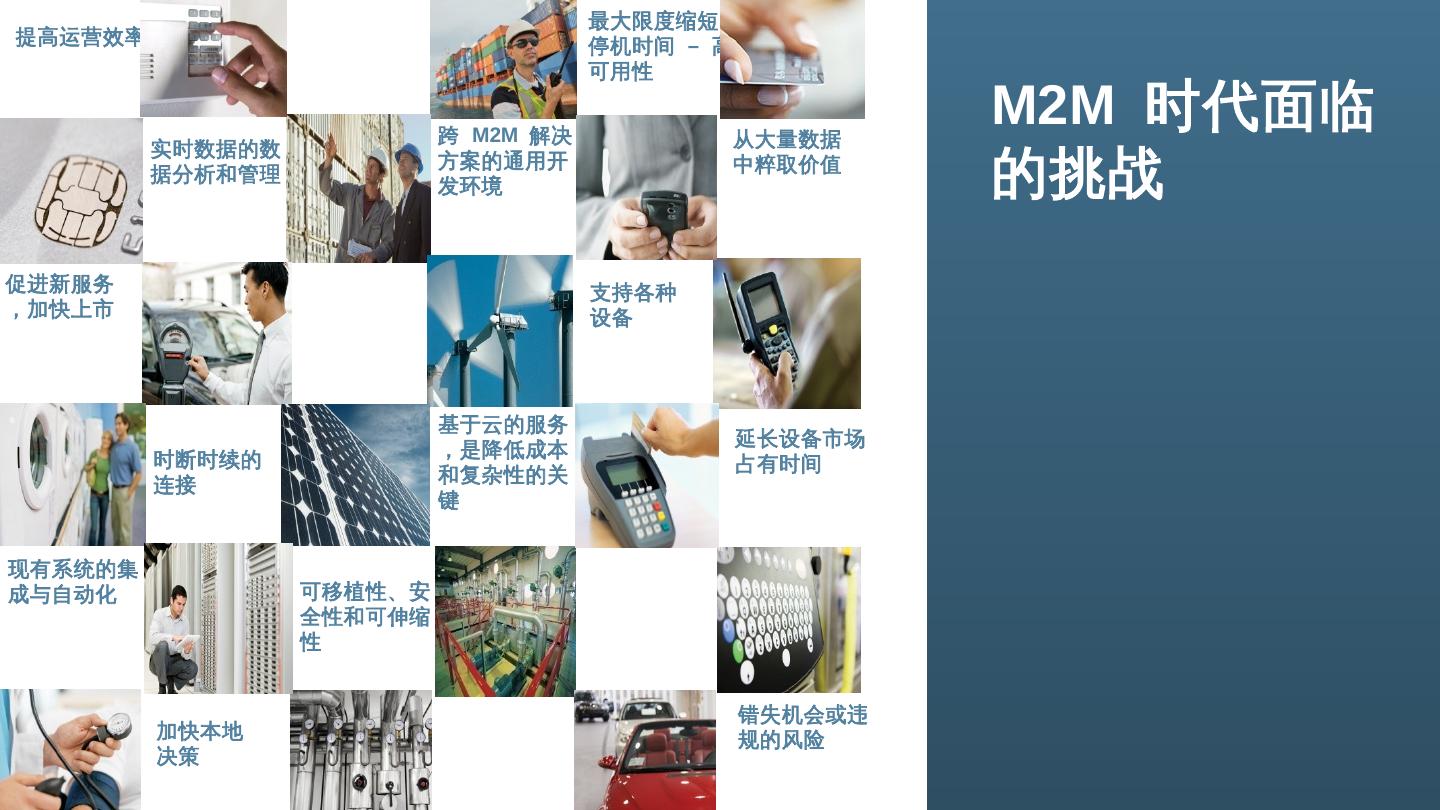 11 .M2M 时代面临的挑战 促进新服务,加快上市 实时数据的数据分析和管理 最大限度缩短停机时间 - 高可用性 基于云的服务,是降低成本和复杂性的关键 跨 M2M 解决方案的通用开发环境 加快本地 决策 延长设备市场 占有时间 错失机会或违规的风险 提高运营效率 现有系统的集成与自动化 可移植性、安全性和可伸缩性 从大量数据中粹取价值 支持各种 设备 时断时续的连接