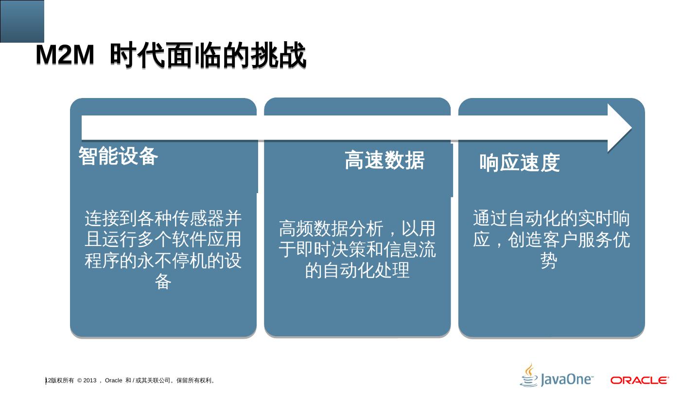 12 .M2M 时代面临的挑战 连接到各种传感器并且运行多个软件应用程序的永不停机的设备 高频数据分析,以用于即时决策和信息流的自动化处理 通过自动化的实时响应,创造客户服务优势 响应速度 高速数据 智能设备