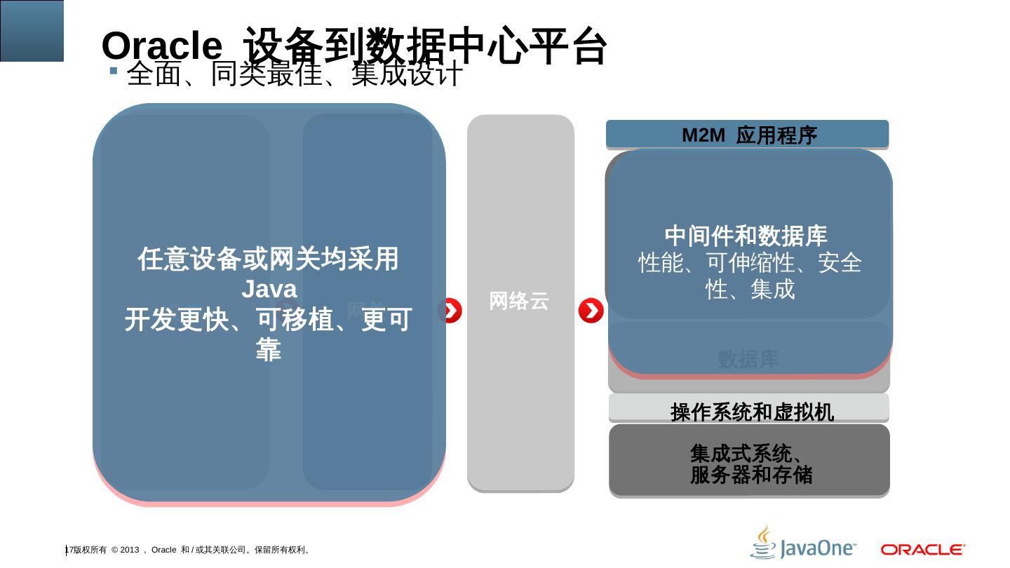 16 .Oracle 设备到数据中心平台 全面、同类最佳、集成设计 网关 网络 云 设备 网络 云 设备 网关 M2M 应用程序 中间件 操作系统和虚拟机 数据库 集成式系统、 服务器和存储 任意设备或网关均采用 Java 开发更快、可移植、更可靠 网络云