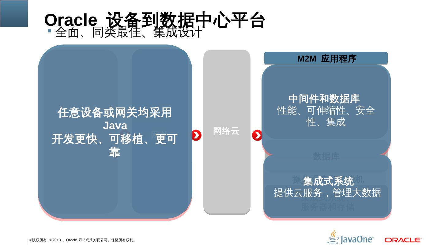 17 .Oracle 设备到数据中心平台 全面、同类最佳、集成设计 网关 网络 云 设备 网络 云 设备 网关 M2M 应用程序 中间件 操作系统和虚拟机 数据库 集成式系统、 服务器和存储 网络云 任意设备或网关均采用 Java 开发更快、可移植、更可靠 中间件和数据库 性能、可伸缩性 、 安全性、集成