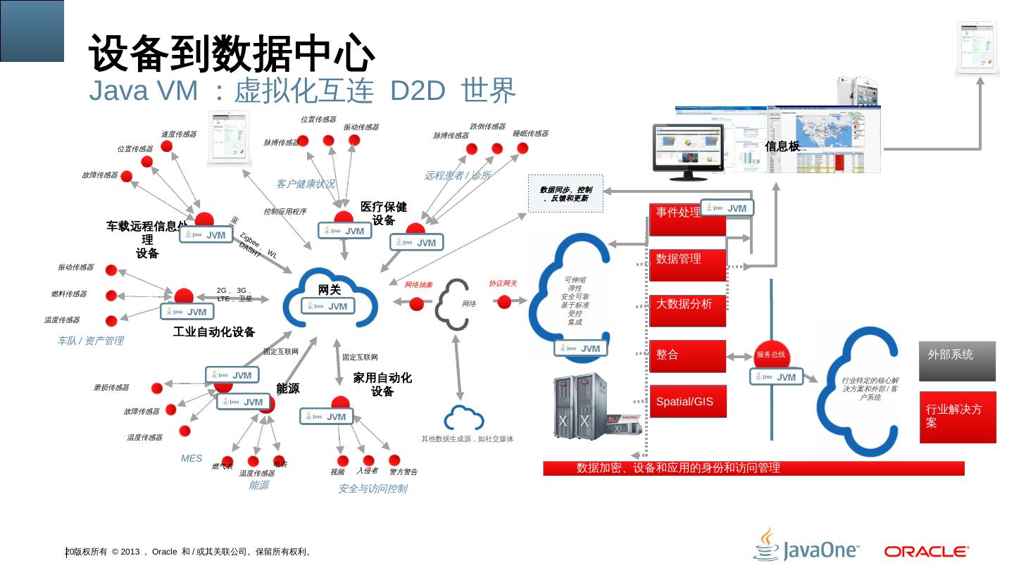 20 .设备到数据中心 Java VM:虚拟化互连 D2D 世界 温度传感器 协议网关 家用自动化 设备 MES 车载远程信息处理 设备 医疗保健 设备 能源 安全与访问控制 工业自动化设备 车队/资产管理 客户健康状况 远程患者/诊所 速度传感器 位置传感器 故障传感器 振动传感器 燃料传感器 磨损传感器 故障传感器 温度传感器 温度传感器 燃气表 电表 视频 入侵者 警方警告 脉搏传感器 位置传感器 振动传感器 脉搏传感器 跌倒传感器 睡眠传感器 网络 可伸缩 弹性 安全可靠 基于标准 受控 集成 蓝牙、Zigbee、WLAN、DASH7 固定互联网 2G、3G、LTE、卫星 固定互联网 事件处理 数据管理 大数据分析 整合 Spatial/GIS 行业解决方案 服务总线 外部系统 行业特定的核心解决方案和外部/客户系统 信息板 数据加密、设备和应用的身份和访问管理 数据同步、控制、反馈和更新 控制应用程序 能源 其他数据生成源,如社交媒体 网络抽象 网关