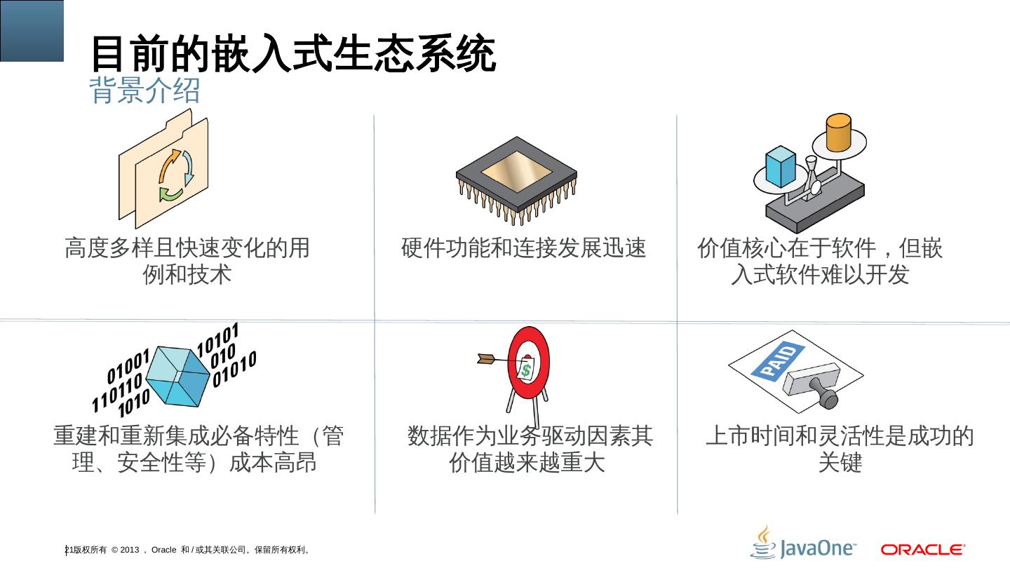 21 .目前的嵌入式生态系统 背景介绍 高度多样且快速变化的用例和技术 硬件功能和连接发展迅速 价值核心在于软件,但嵌入式软件难以开发 重建和重新集成必备特性(管理、安全性等)成本高昂 数据作为业务驱动因素其价值越来越重大 上市时间和灵活性是成功的关键