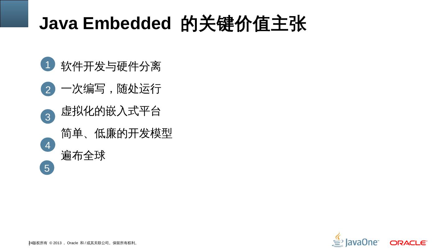 24 .Java Embedded 的关键价值主张 软件开发与硬件分离 一次编写,随处运行 虚拟化的嵌入式平台 简单、低廉的开发模型 遍布全球 1 2 3 4 5