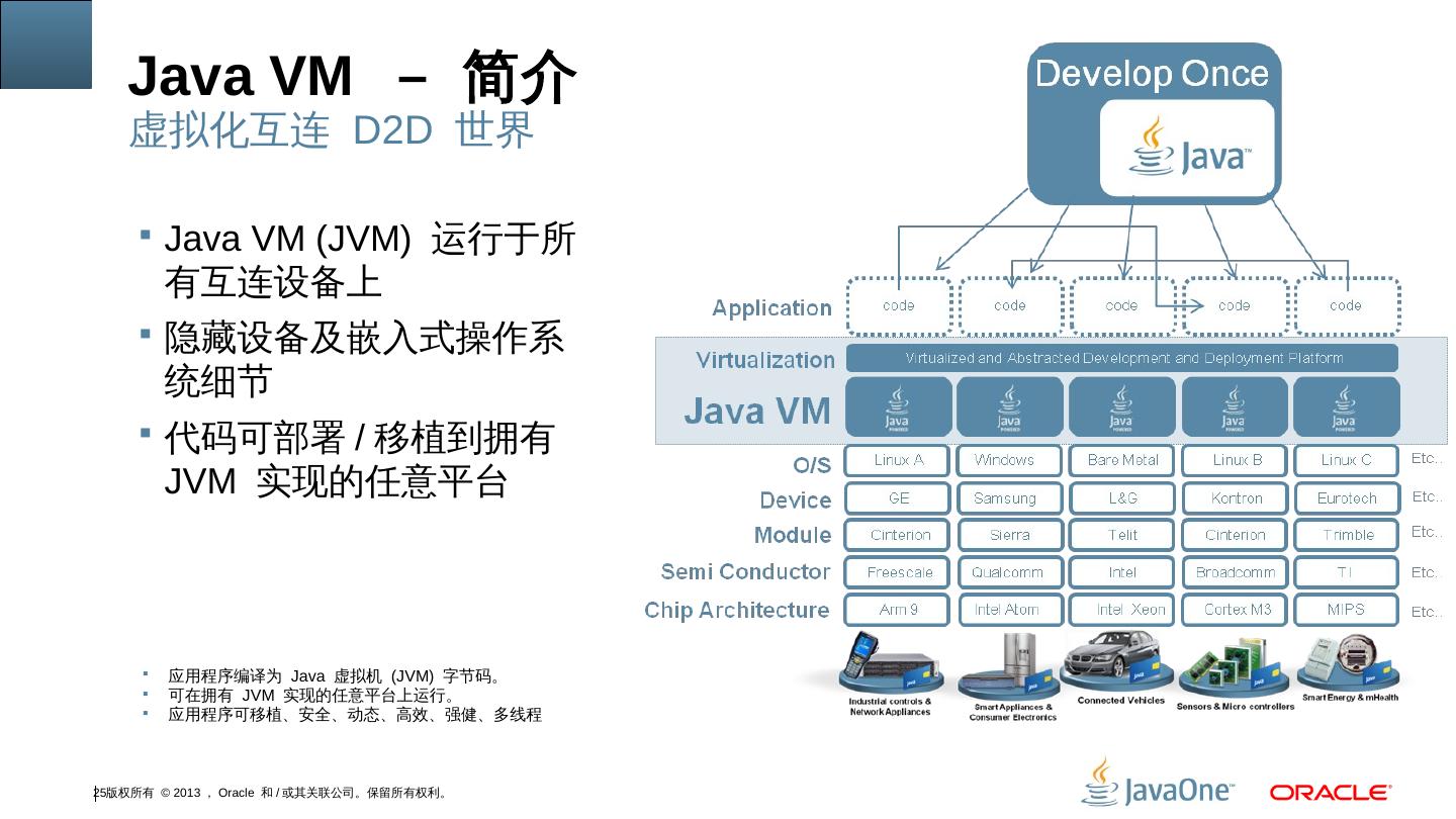 25 .Java VM - 简介 虚拟化互连 D2D 世界 Java VM (JVM) 运行于所有互连设备上 隐藏设备及嵌入式操作系统细节 代码可部署 / 移植到拥有 JVM 实现的任意平台 应用程序编译为 Java 虚拟机 (JVM) 字节码。 可在拥有 JVM 实现的任意平台上运行。 应用程序可移植、安全、动态、高效、强健、多线程