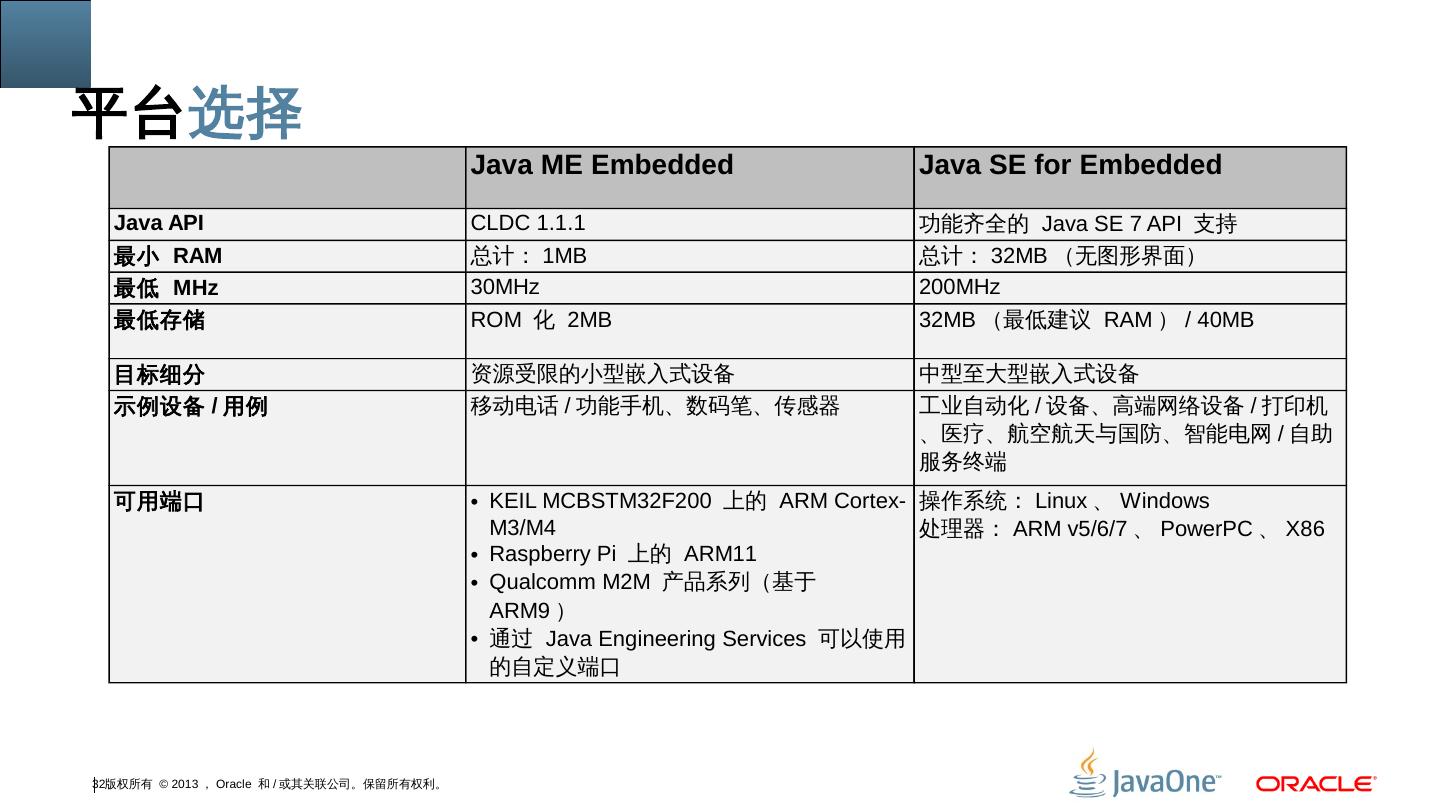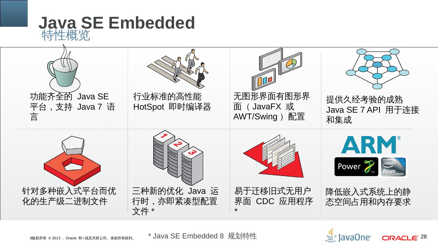 27 .27 Java ME Embedded 特性概览 基于久经考验的 Java 嵌入式平台(15 年成熟度)的 Java ME 标准 高度优化的多任务 CLDC-HI Java 虚拟机 完全 无图形界面 运行 ,带有线和无线连接 支持与各种外设连接 最适合细粒度的现场升级 - 全固件、JVM 或应用程序 可配置的远程应用程序部署和管理 支持多 RTOS 或裸机 最适合有低内存要求的微处理器级系统