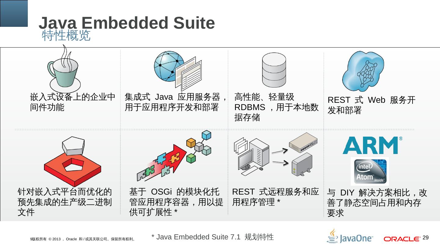 28 .28 Java SE Embedded 特性概览 功能齐全的 Java SE 平台,支持 Java 7 语言 行业标准的高性能 HotSpot 即时编译器 无图形界面 有 图形界面 ( JavaFX 或 AWT/ Swing)配置 提供久经考验的成熟 Java SE 7 API 用于连接和集成 针对多种嵌入式平台而优化的生产级二进制文件 三种新的优化 Java 运行时,亦即紧凑型配置文件* 易于迁移旧式 无用户界面 CDC 应用程序 * 降低嵌入式系统上的静态空间占用和内存要求 * Java SE Embedded 8 规划特性