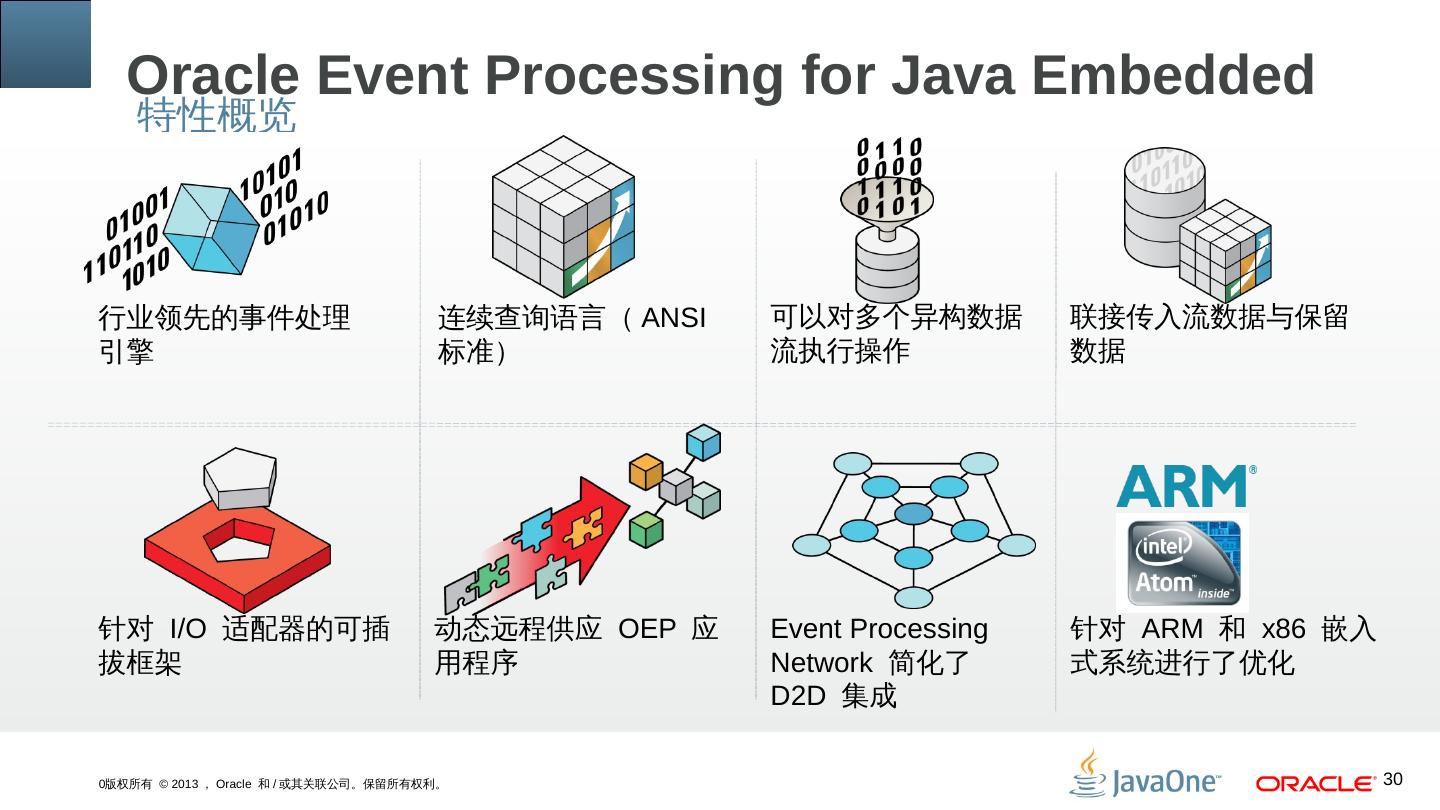 29 .29 Java Embedded Suite 特性概览 嵌入式设备上的企业中间件功能 集成式 Java 应用服务器,用于应用程序开发和部署 高性能、轻量级 RDBMS,用于本地数据存储 REST 式 Web 服务开发和部署 针对嵌入式平台而优化的预先集成的生产级二进制文件 基于 OSGi 的模块化托管应用程序容器,用以提供可扩展性* REST 式远程服务和应用程序管理* 与 DIY 解决方案相比,改善了静态空间占用和内存要求 * Java Embedded Suite 7.1 规划特性
