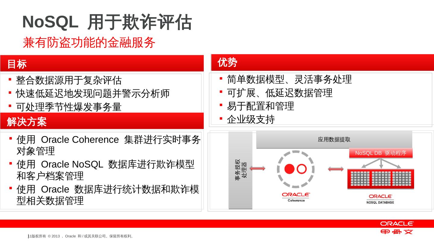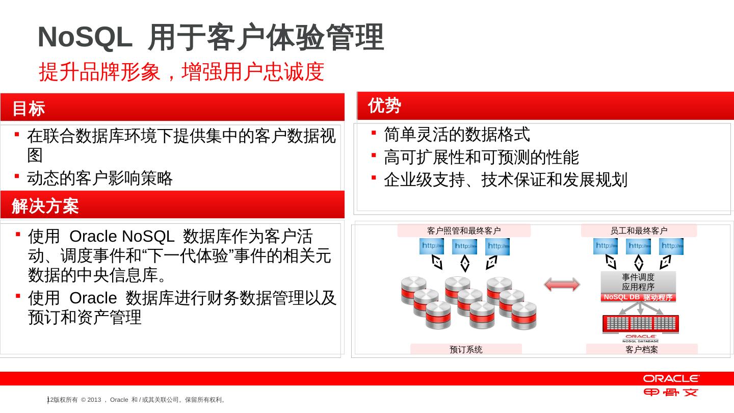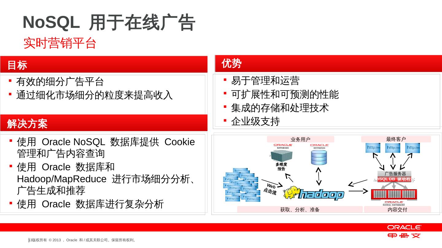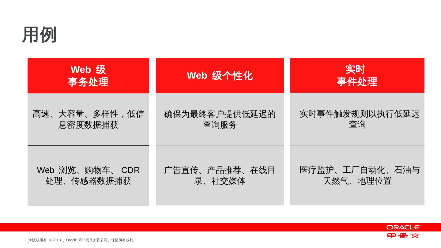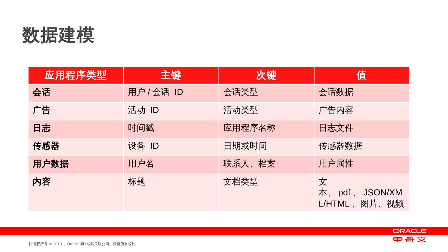 支持的操作系统— Linux 和Solaris 10; Oracle NoSQL DB 是用Java 语言编写的; Java 和C API ... NoSQL DB 驱动程序 ... 字符串. 主键:. 次键:. 字节数组. 值:. 梅西百货. $59.00, $21.99. 红色、蓝色、绿色 ... 传感器, 设备ID, 日期或时间, 传感器数据.