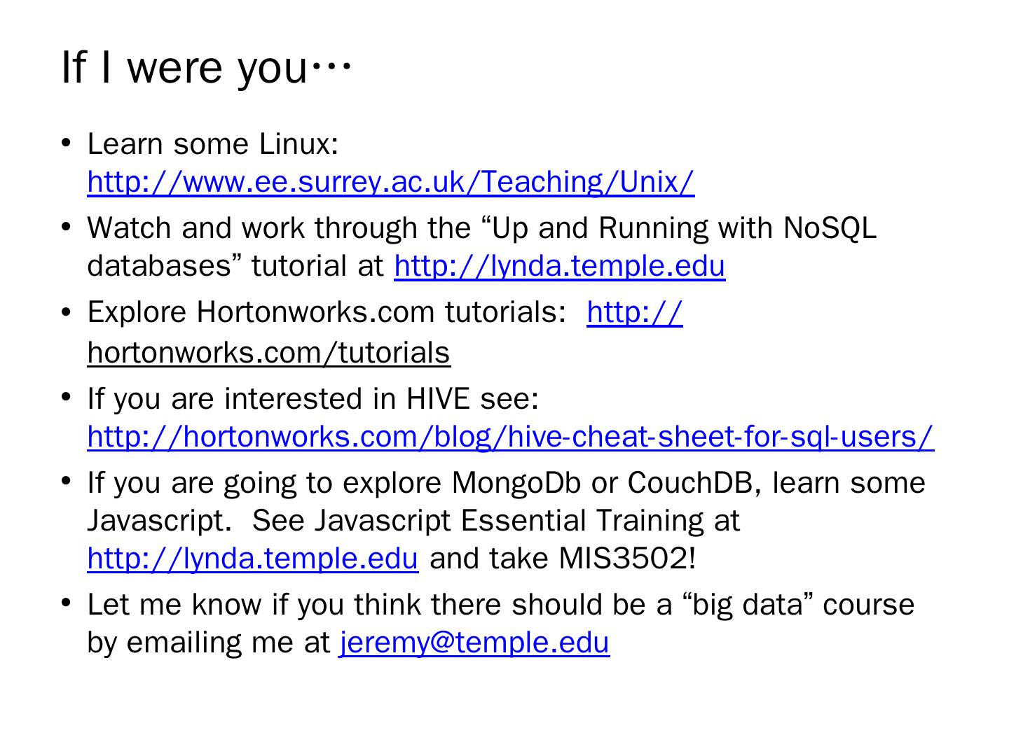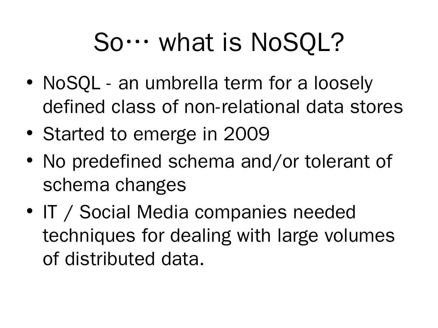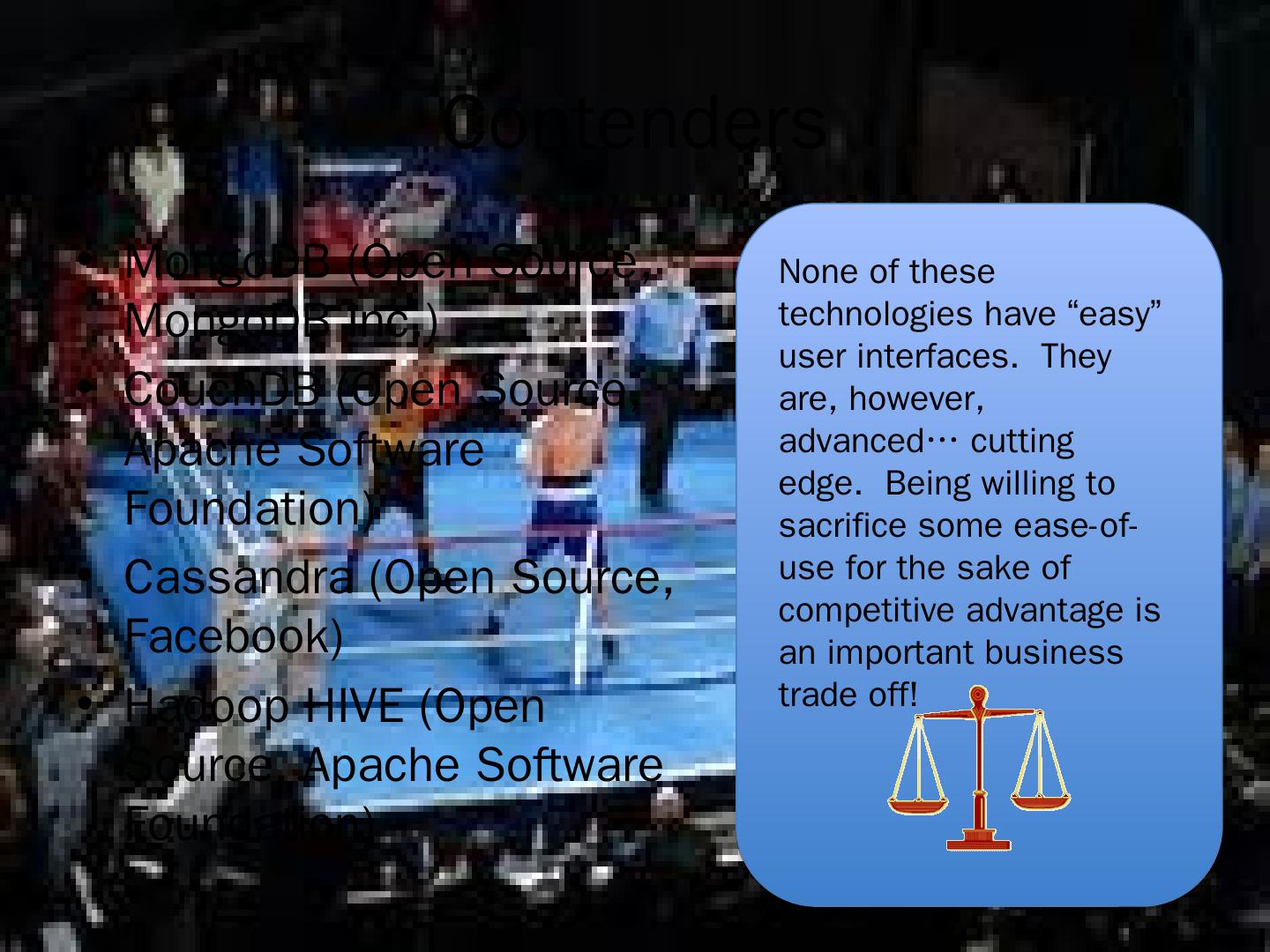 MongoDB (Open Source, MongoDB Inc.) CouchDB (Open Source, Apache Software Foundation); Cassandra (Open Source, Facebook); Hadoop HIVE (Open ...