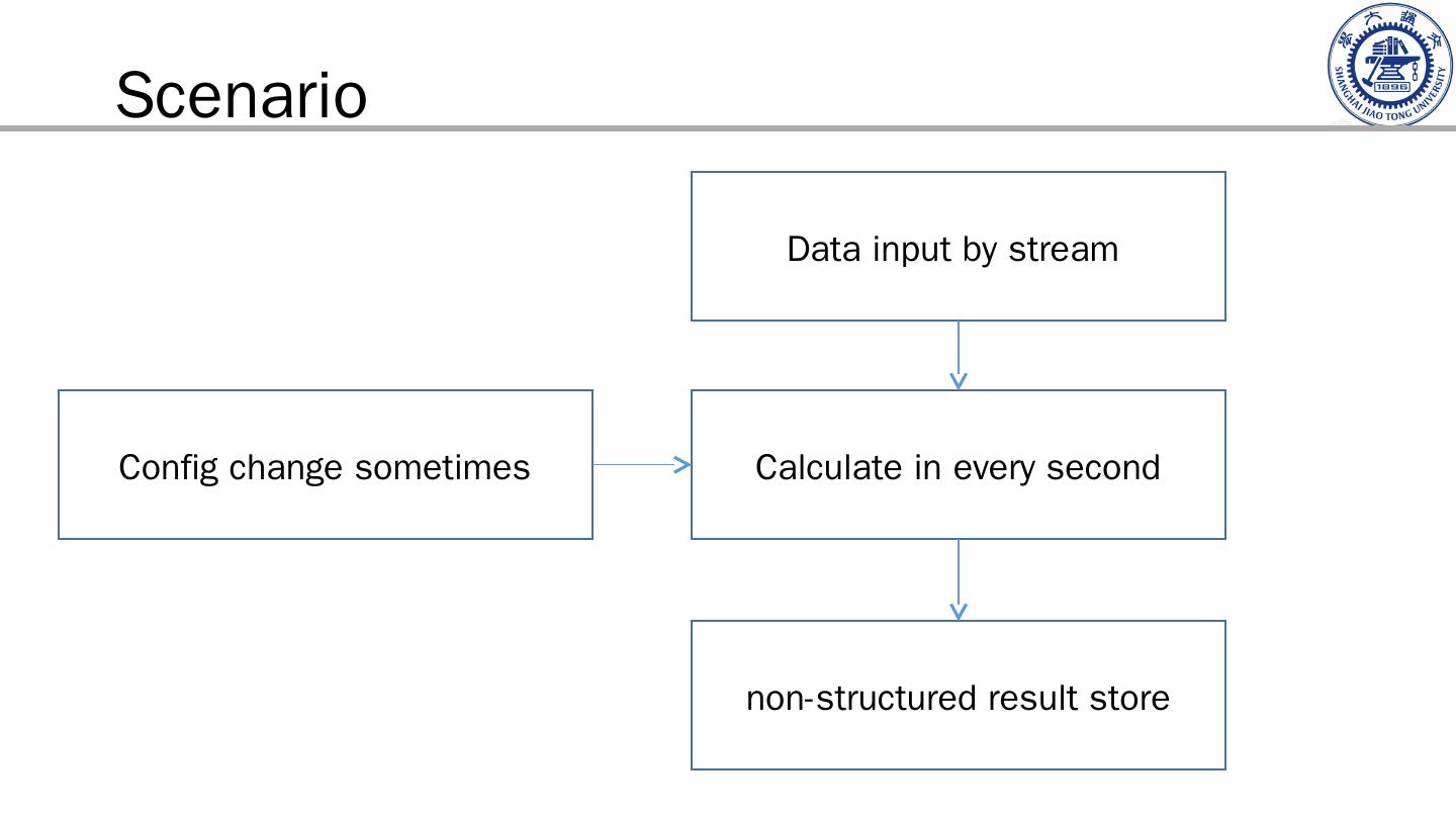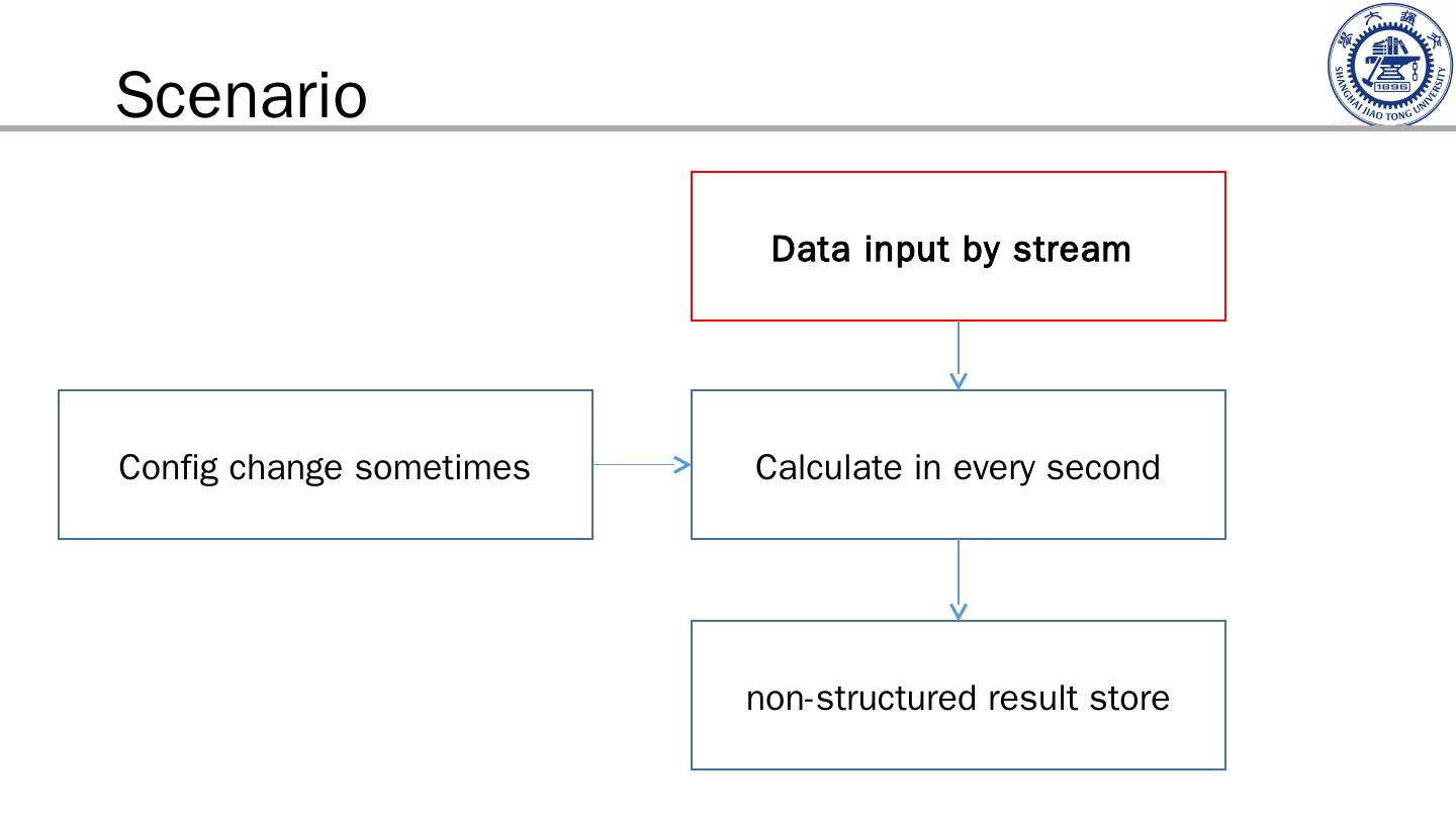 Data input by stream. Calculate in every second. non-structured result store. Config change ... Contents. Kafka; Spark Streaming; Zookeeper; MongoDB. 1/1/97.