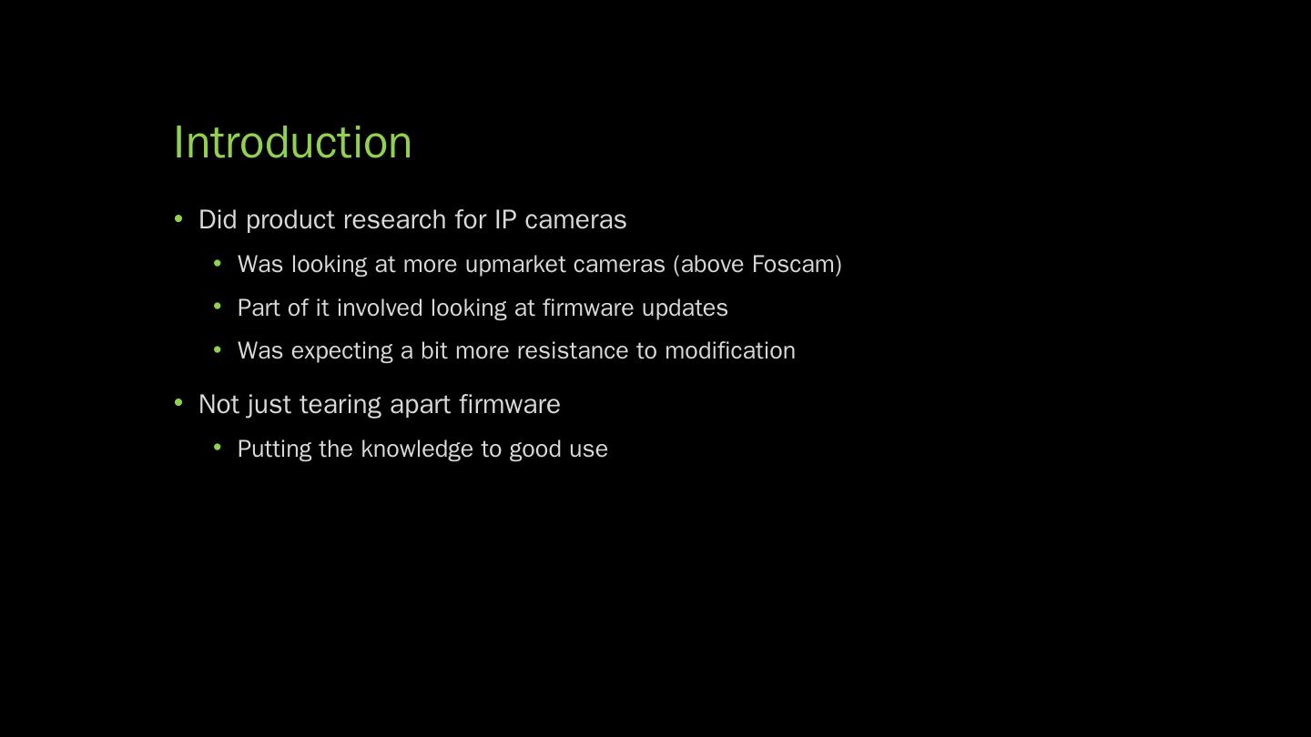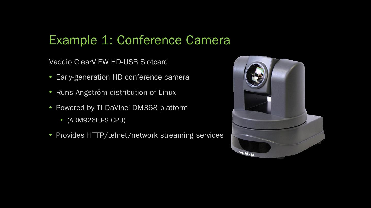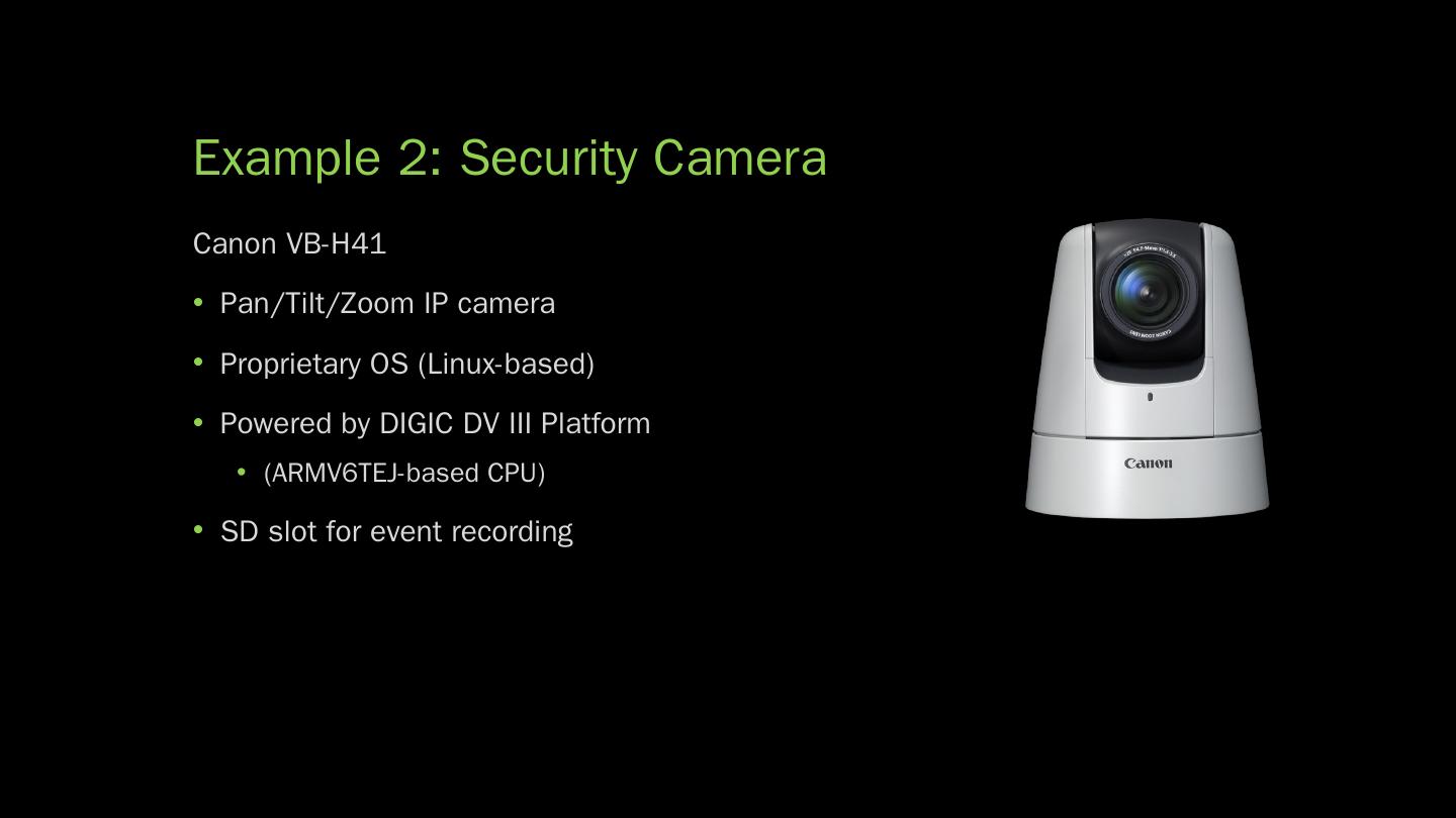 Bootloader; Updated environment; Support scripts; Python Interpreter; Other ... Pan/Tilt/Zoom IP camera; Proprietary OS (Linux-based); Powered by DIGIC DV III ...