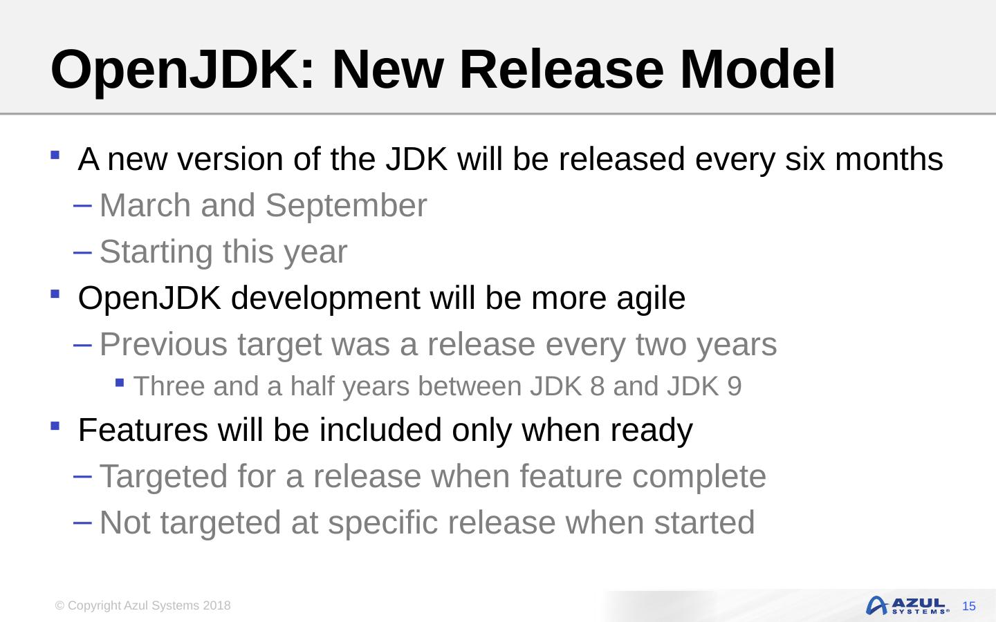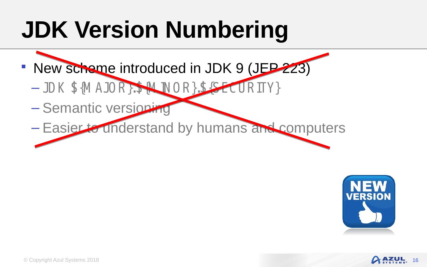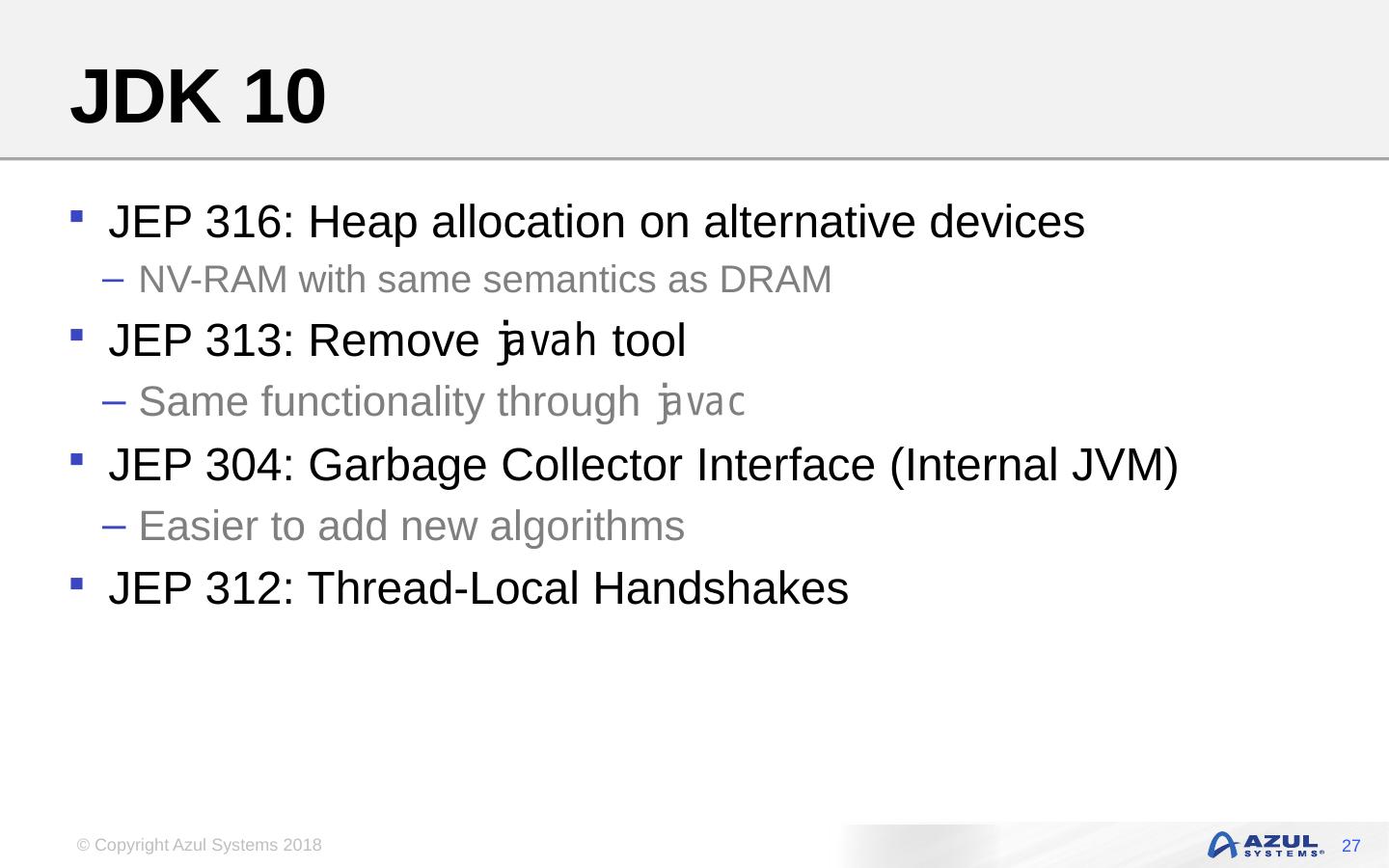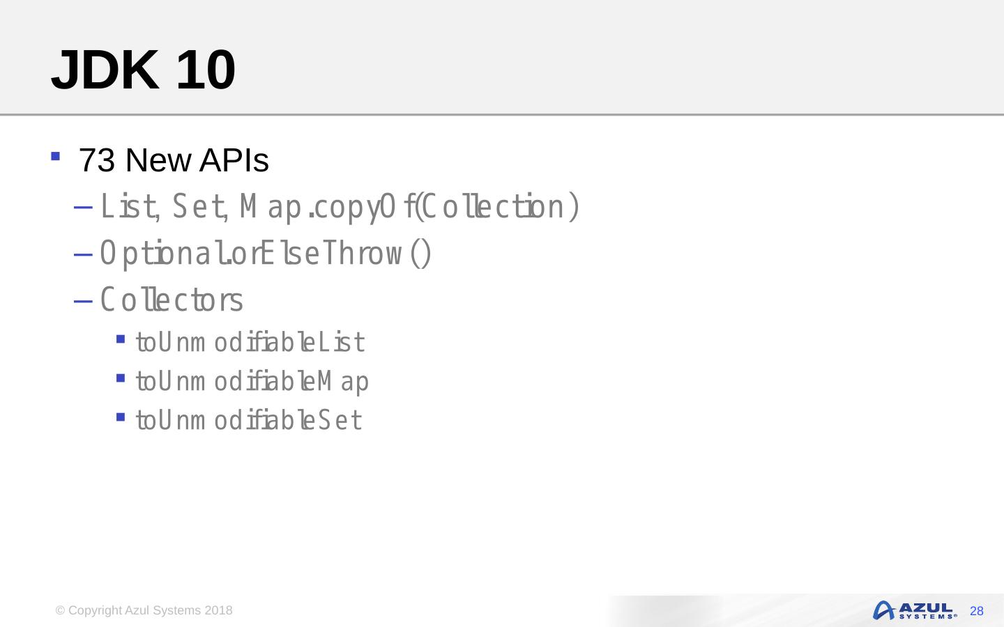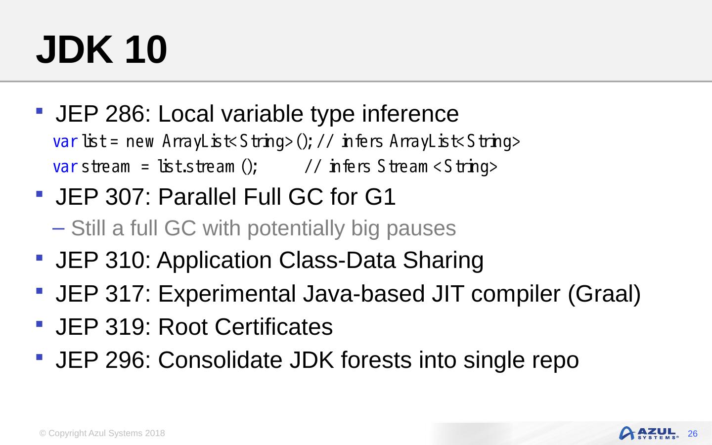 Java Platform Module System (JPMS). The core Java libraries are now a set of modules (JEP 220). 97 modules: 28 Java SE, 8 JavaFX, 59 JDK, 2 Oracle.
