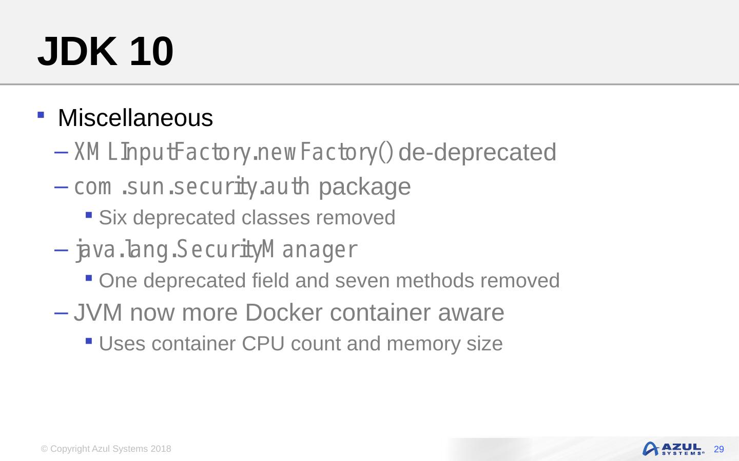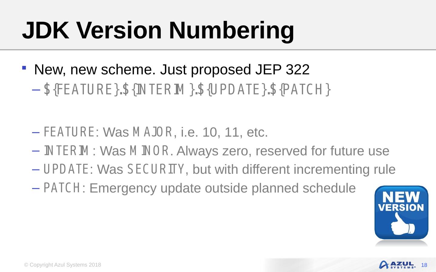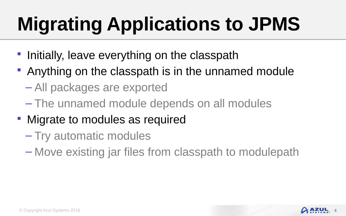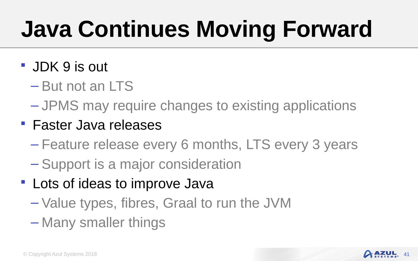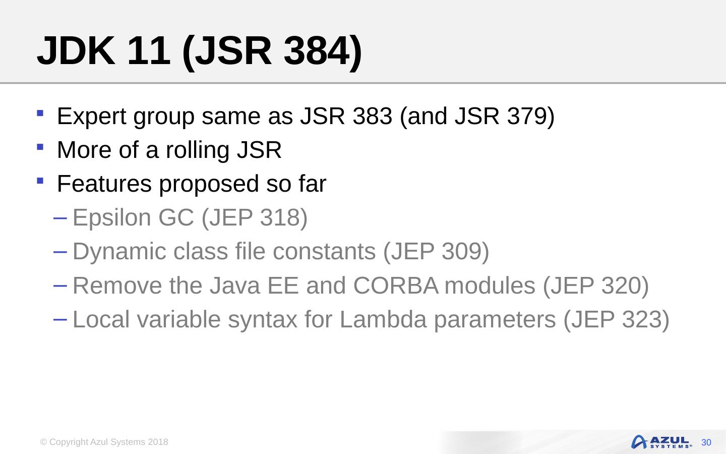 Java Platform Module System (JPMS). The core Java libraries are now a set of modules (JEP 220). 97 modules: 28 Java SE, 8 JavaFX, 59 JDK, 2 Oracle.