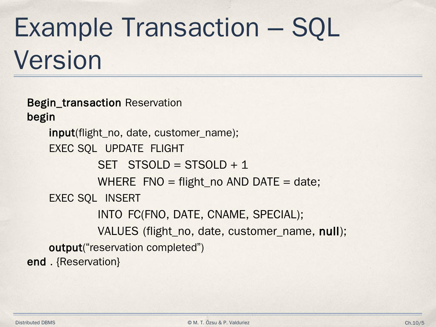 Example Database. Consider an airline reservation example with the relations: FLIGHT(FNO, DATE, SRC, DEST, STSOLD, CAP). CUST(CNAME, ADDR, BAL).
