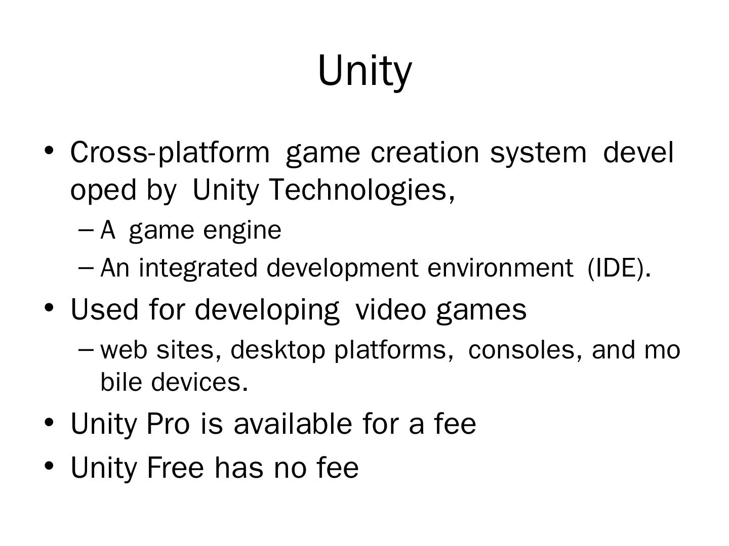 4 . Unity • Cross-platform game creation system devel oped by Unity Technologies, – A game engine – An integrated development environment (IDE). • Used for developing video games – web sites, desktop platforms, consoles, and mo bile devices. • Unity Pro is available for a fee • Unity Free has no fee