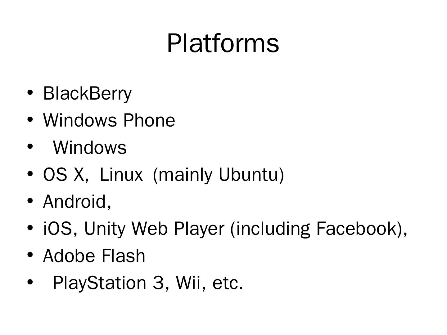 5 . Platforms • BlackBerry • Windows Phone • Windows • OS X, Linux (mainly Ubuntu) • Android, • iOS, Unity Web Player (including Facebook), • Adobe Flash • PlayStation 3, Wii, etc.