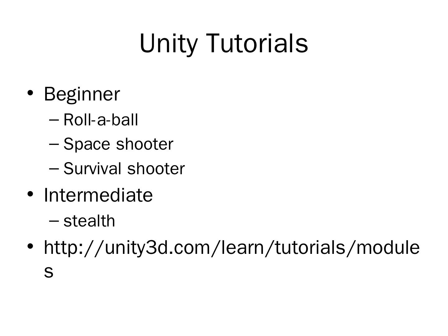 6 . Unity Tutorials • Beginner – Roll-a-ball – Space shooter – Survival shooter • Intermediate – stealth • http://unity3d.com/learn/tutorials/module s