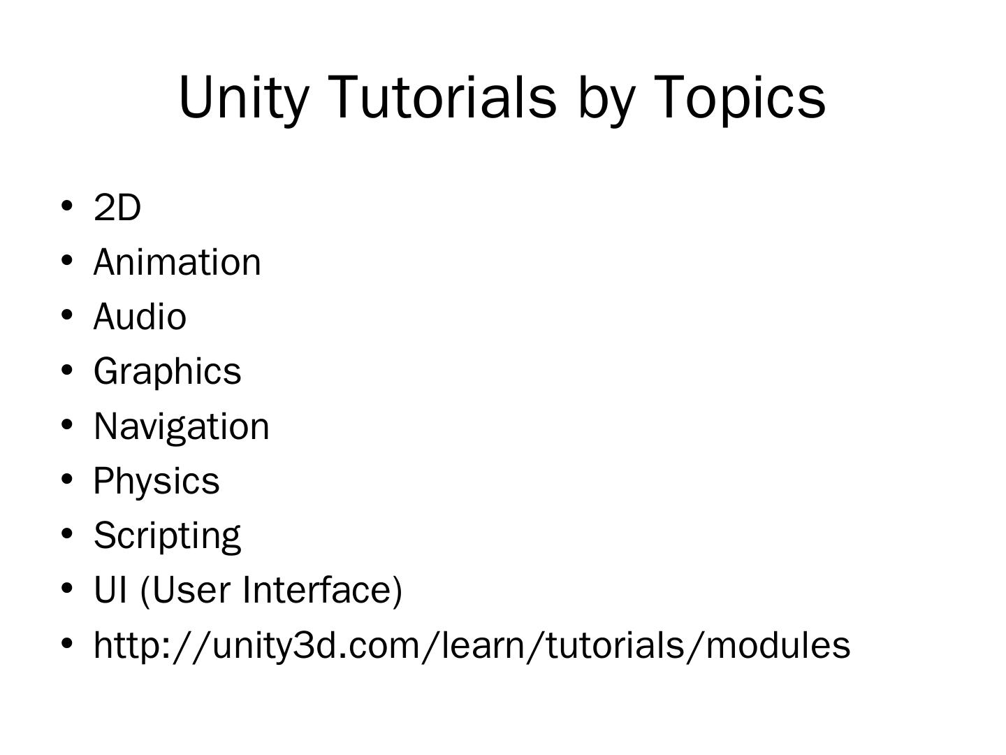 7 . Unity Tutorials by Topics • 2D • Animation • Audio • Graphics • Navigation • Physics • Scripting • UI (User Interface) • http://unity3d.com/learn/tutorials/modules