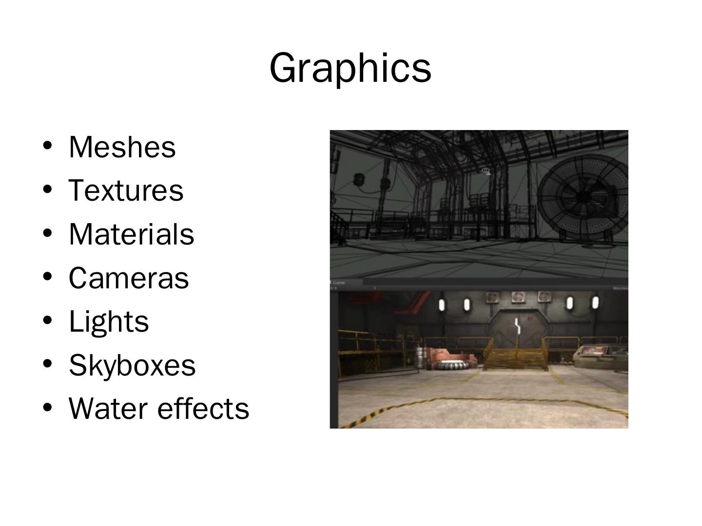 9 . Graphics • Meshes • Textures • Materials • Cameras • Lights • Skyboxes • Water effects