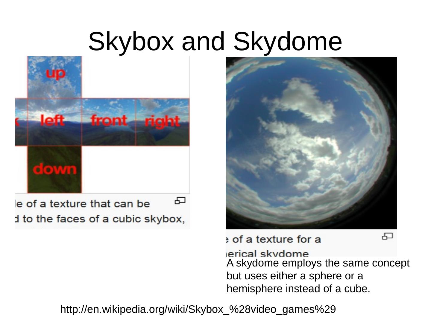 18 . Skybox and Skydome A skydome employs the same concept but uses either a sphere or a hemisphere instead of a cube. http://en.wikipedia.org/wiki/Skybox_%28video_games%29