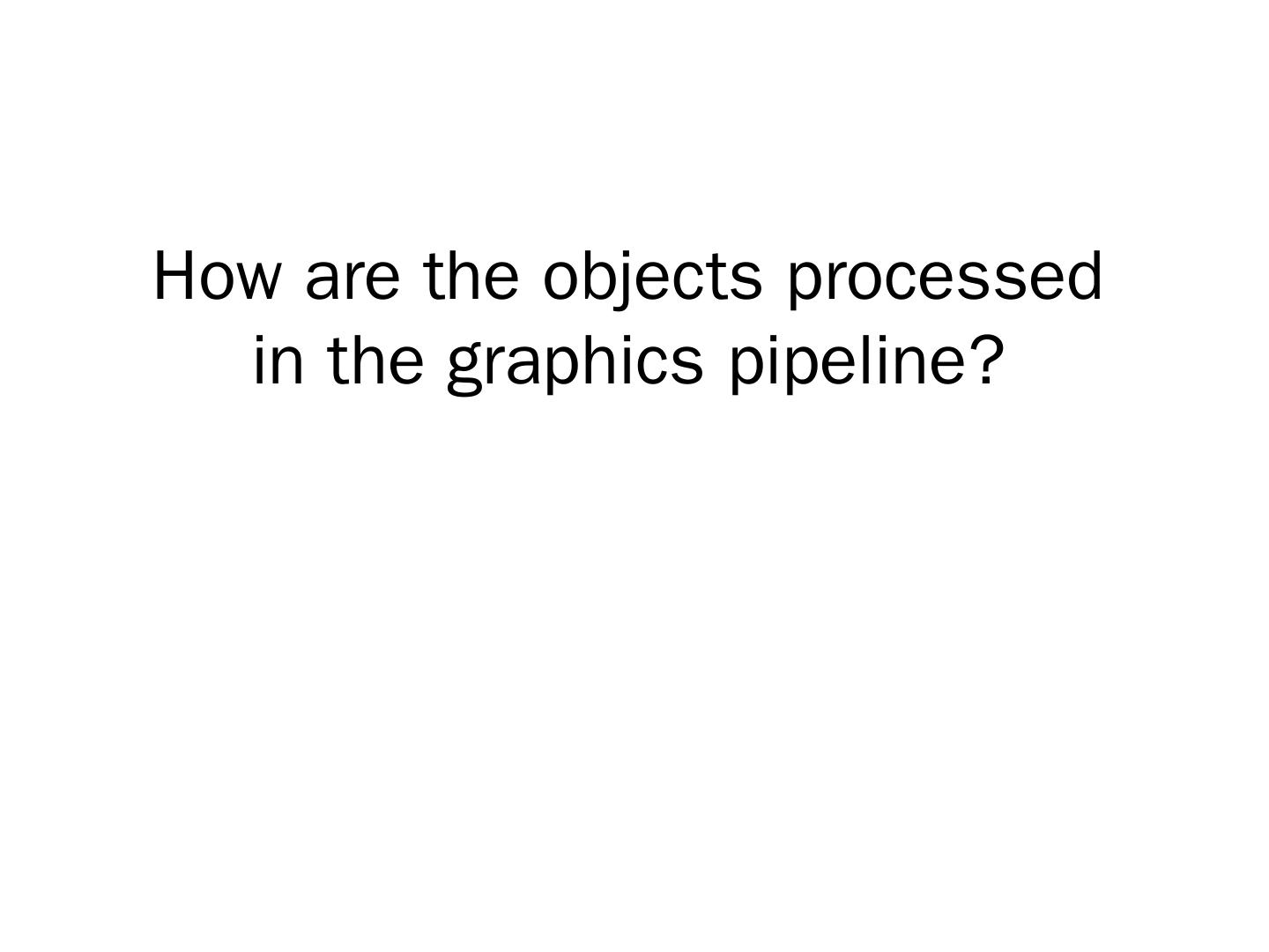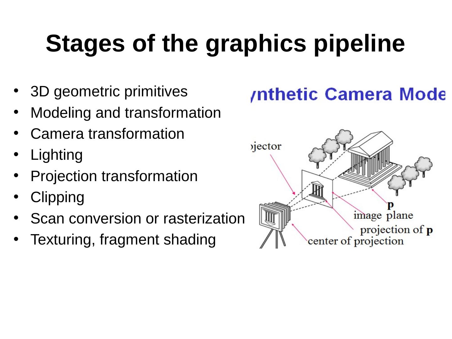 20 . Stages of the graphics pipeline • 3D geometric primitives • Modeling and transformation • Camera transformation • Lighting • Projection transformation • Clipping • Scan conversion or rasterization • Texturing, fragment shading