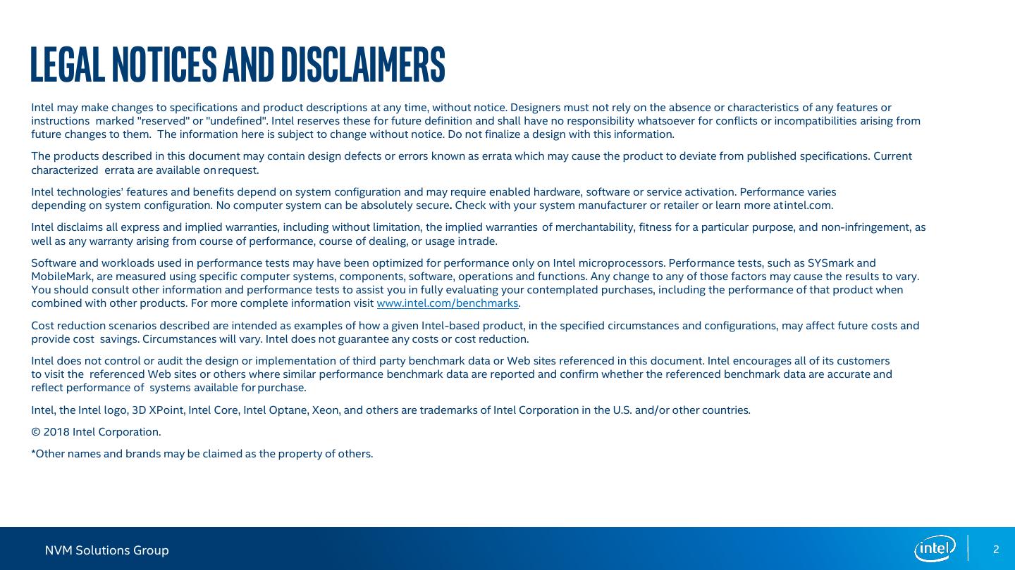 2 .Legal Notices and Disclaimers Intel may make changes to specifications and product descriptions at any time, without notice. Designers must not rely on the absence or characteristics of any features or instructions marked "reserved" or "undefined". Intel reserves these for future definition and shall have no responsibility whatsoever for conflicts or incompatibilities arising from future changes to them. The information here is subject to change without notice. Do not finalize a design with this information. The products described in this document may contain design defects or errors known as errata which may cause the product to deviate from published specifications. Current characterized errata are available on request. Intel technologies’ features and benefits depend on system configuration and may require enabled hardware, software or service activation. Performance varies depending on system configuration. No computer system can be absolutely secure. Check with your system manufacturer or retailer or learn more atintel.com. Intel disclaims all express and implied warranties, including without limitation, the implied warranties of merchantability, fitness for a particular purpose, and non-infringement, as well as any warranty arising from course of performance, course of dealing, or usage in trade. Software and workloads used in performance tests may have been optimized for performance only on Intel microprocessors. Performance tests, such as SYSmark and MobileMark, are measured using specific computer systems, components, software, operations and functions. Any change to any of those factors may cause the results to vary. You should consult other information and performance tests to assist you in fully evaluating your contemplated purchases, including the performance of that product when combined with other products. For more complete information visit www.intel.com/benchmarks. Cost reduction scenarios described are intended as examples of how a given Intel-based product, in the specified circumstances and configurations, may affect future costs and provide cost savings. Circumstances will vary. Intel does not guarantee any costs or cost reduction. Intel does not control or audit the design or implementation of third party benchmark data or Web sites referenced in this document. Intel encourages all of its customers to visit the referenced Web sites or others where similar performance benchmark data are reported and confirm whether the referenced benchmark data are accurate and reflect performance of systems available for purchase. Intel, the Intel logo, 3D XPoint, Intel Core, Intel Optane, Xeon, and others are trademarks of Intel Corporation in the U.S. and/or other countries. © 2018 Intel Corporation. *Other names and brands may be claimed as the property of others. NVM Solutions Group 2