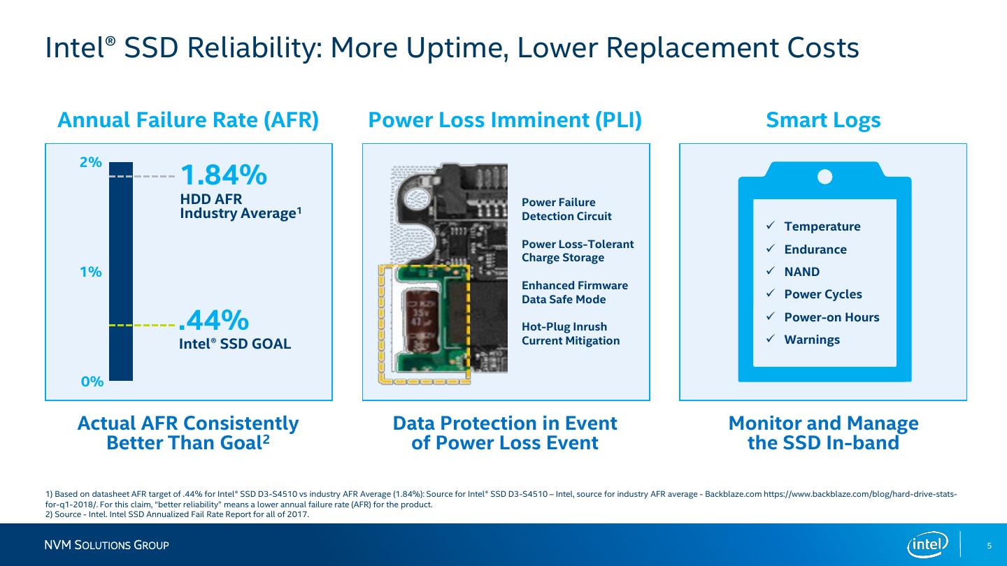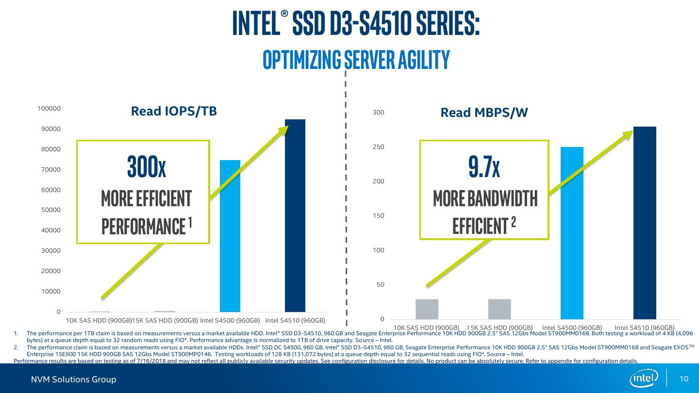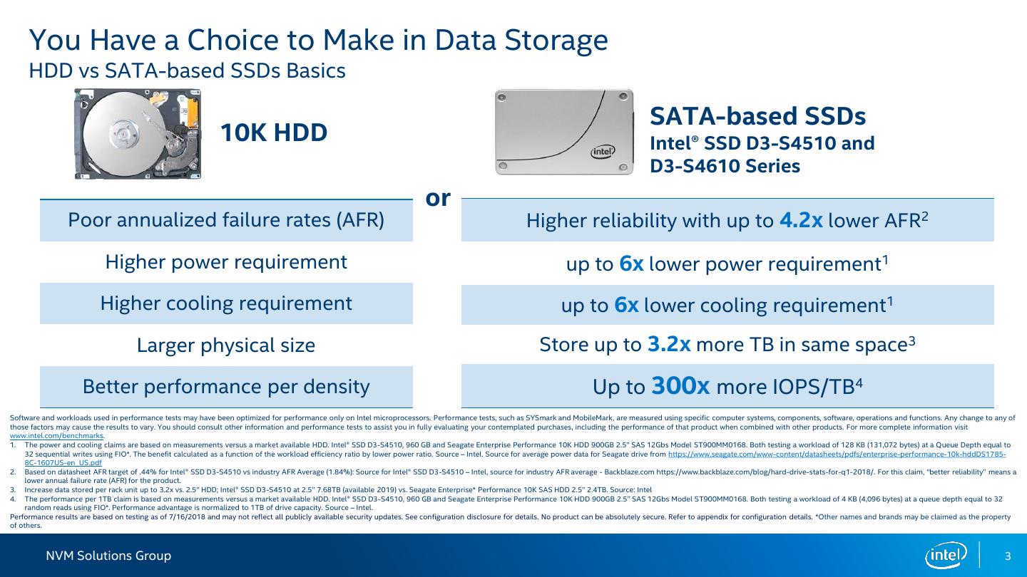 3 . You Have a Choice to Make in Data Storage HDD vs SATA-based SSDs Basics SATA-based SSDs 10K HDD Intel® SSD D3-S4510 and D3-S4610 Series or Poor annualized failure rates (AFR) Higher reliability with up to 4.2x lower AFR2 Higher power requirement up to 6x lower power requirement1 Higher cooling requirement up to 6x lower cooling requirement1 Larger physical size Store up to 3.2x more TB in same space3 Better performance per density Up to 300x more IOPS/TB4 Software and workloads used in performance tests may have been optimized for performance only on Intel microprocessors. Performance tests, such as SYSmark and MobileMark, are measured using specific computer systems, components, software, operations and functions. Any change to any of those factors may cause the results to vary. You should consult other information and performance tests to assist you in fully evaluating your contemplated purchases, including the performance of that product when combined with other products. For more complete information visit www.intel.com/benchmarks. 1. The power and cooling claims are based on measurements versus a market available HDD. Intel® SSD D3-S4510, 960 GB and Seagate Enterprise Performance 10K HDD 900GB 2.5” SAS 12Gbs Model ST900MM0168. Both testing a workload of 128 KB (131,072 bytes) at a Queue Depth equal to 32 sequential writes using FIO*. The benefit calculated as a function of the workload efficiency ratio by lower power ratio. Source – Intel. Source for average power data for Seagate drive from https://www.seagate.com/www-content/datasheets/pdfs/enterprise-performance-10k-hddDS1785- 8C-1607US-en_US.pdf 2. Based on datasheet AFR target of .44% for Intel® SSD D3-S4510 vs industry AFR Average (1.84%): Source for Intel® SSD D3-S4510 – Intel, source for industry AFR average - Backblaze.com https://www.backblaze.com/blog/hard-drive-stats-for-q1-2018/. For this claim, “better reliability” means a lower annual failure rate (AFR) for the product. 3. Increase data stored per rack unit up to 3.2x vs. 2.5” HDD; Intel® SSD D3-S4510 at 2.5” 7.68TB (available 2019) vs. Seagate Enterprise* Performance 10K SAS HDD 2.5” 2.4TB. Source: Intel 4. The performance per 1TB claim is based on measurements versus a market available HDD. Intel® SSD D3-S4510, 960 GB and Seagate Enterprise Performance 10K HDD 900GB 2.5” SAS 12Gbs Model ST900MM0168. Both testing a workload of 4 KB (4,096 bytes) at a queue depth equal to 32 random reads using FIO*. Performance advantage is normalized to 1TB of drive capacity. Source – Intel. Performance results are based on testing as of 7/16/2018 and may not reflect all publicly available security updates. See configuration disclosure for details. No product can be absolutely secure. Refer to appendix for configuration details. *Other names and brands may be claimed as the property of others. NVM Solutions Group 3