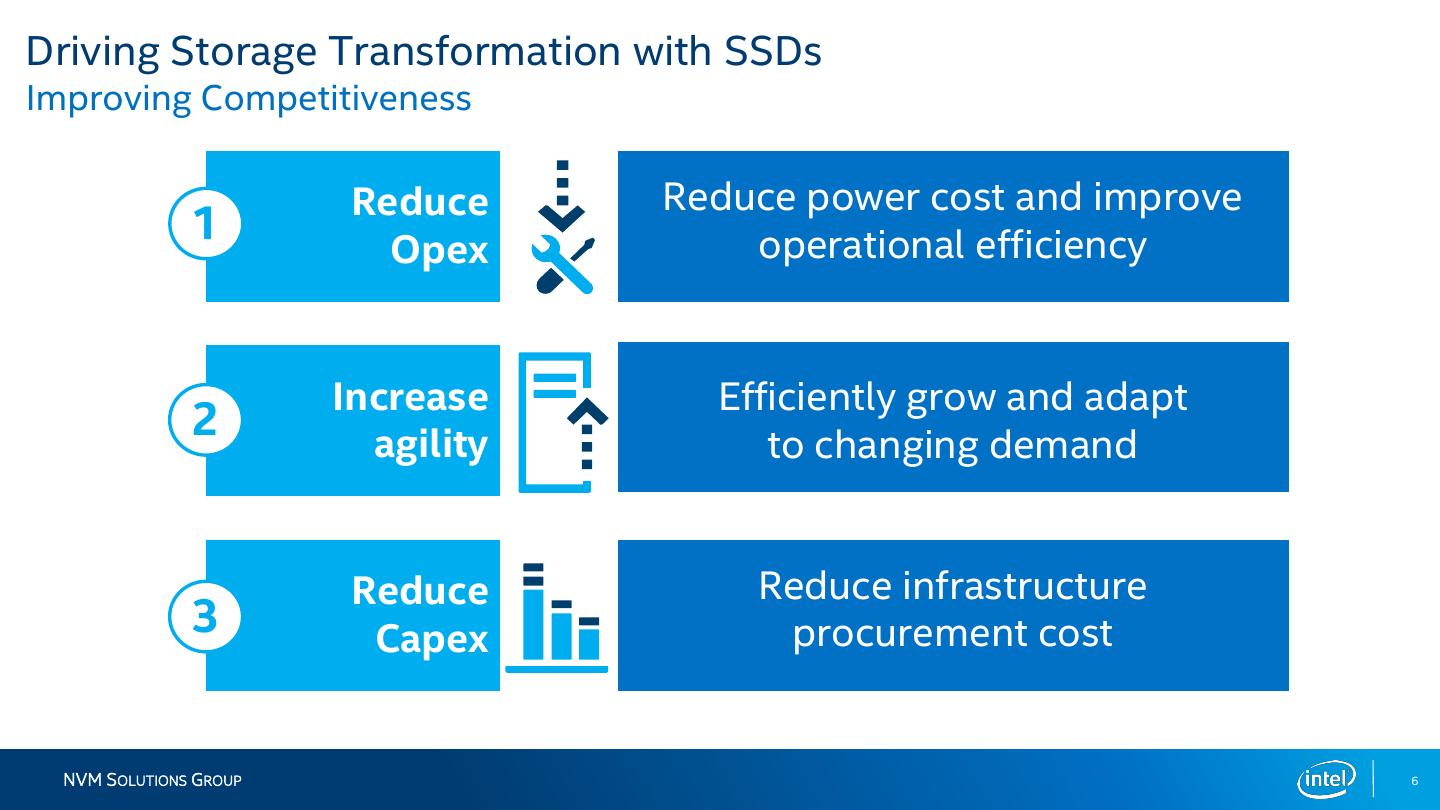5 .Intel® SSD Reliability: More Uptime, Lower Replacement Costs Annual Failure Rate (AFR) Power Loss Imminent (PLI) Smart Logs 2% 1.84% HDD AFR Power Failure Industry Average1 Detection Circuit ✓ Temperature Power Loss-Tolerant ✓ Endurance Charge Storage 1% ✓ NAND Enhanced Firmware Data Safe Mode ✓ Power Cycles .44% Hot-Plug Inrush ✓ Power-on Hours ✓ Warnings Intel® SSD GOAL Current Mitigation 0% Actual AFR Consistently Data Protection in Event Monitor and Manage Better Than Goal2 of Power Loss Event the SSD In-band 1) Based on datasheet AFR target of .44% for Intel® SSD D3-S4510 vs industry AFR Average (1.84%): Source for Intel® SSD D3-S4510 – Intel, source for industry AFR average - Backblaze.com https://www.backblaze.com/blog/hard-drive-stats- for-q1-2018/. For this claim, “better reliability” means a lower annual failure rate (AFR) for the product. 2) Source - Intel. Intel SSD Annualized Fail Rate Report for all of 2017. NVM SOLUTIONS GROUP 5