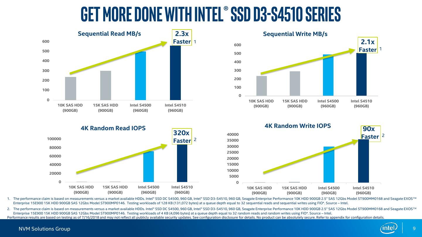 8 . Intel® SSD D3-S4510 and D3-S4610 Series Optimized for space efficient capacity Standard 2U Server up to Storage Capacity To 184 TB 1 2.5” 7mm 7.68TB† Intel® SSD D3-S4510 x 24 3.2x more tB per Server From up to 58 TB 2.5” 2.4TB SATA HDD x 24 Software and workloads used in performance tests may have been optimized for performance only on Intel microprocessors. Performance tests, such as SYSmark and MobileMark, are measured using specific computer systems, components, software, operations and functions. Any change to any of those factors may cause the results to vary. You should consult other information and performance tests to assist you in fully evaluating your contemplated purchases, including the performance of that product when combined with other products. For more complete information visit www.intel.com/benchmarks. Increase data stored per rack unit up to 3.2x vs. 2.5” HDD; Intel® SSD D3-S4510 at 2.5” 7.68TB (available 2019) vs. Seagate Enterprise* Performance 10K SAS HDD 2.5” 2.4TB. Source: Intel Performance results are based on testing as of 7/16/2018 and may not reflect all publicly available security updates. See configuration disclosure for details. No product can be absolutely secure. Refer to appendix for configuration details. † 7.68TB density for both D3-S4510 and D3-S4610 will be available in 2019 NVM Solutions Group 8