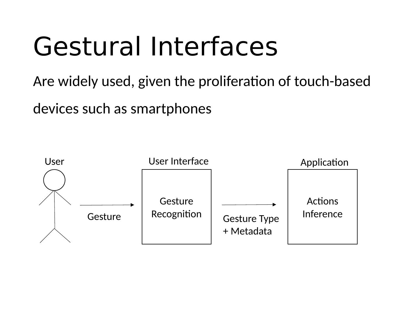 2 .Gestural Interfaces Are widely used, given the proliferation of touch-based devices such as smartphones Gesture Recognition Actions Inference Gesture Gesture Type + Metadata User Interface Application User