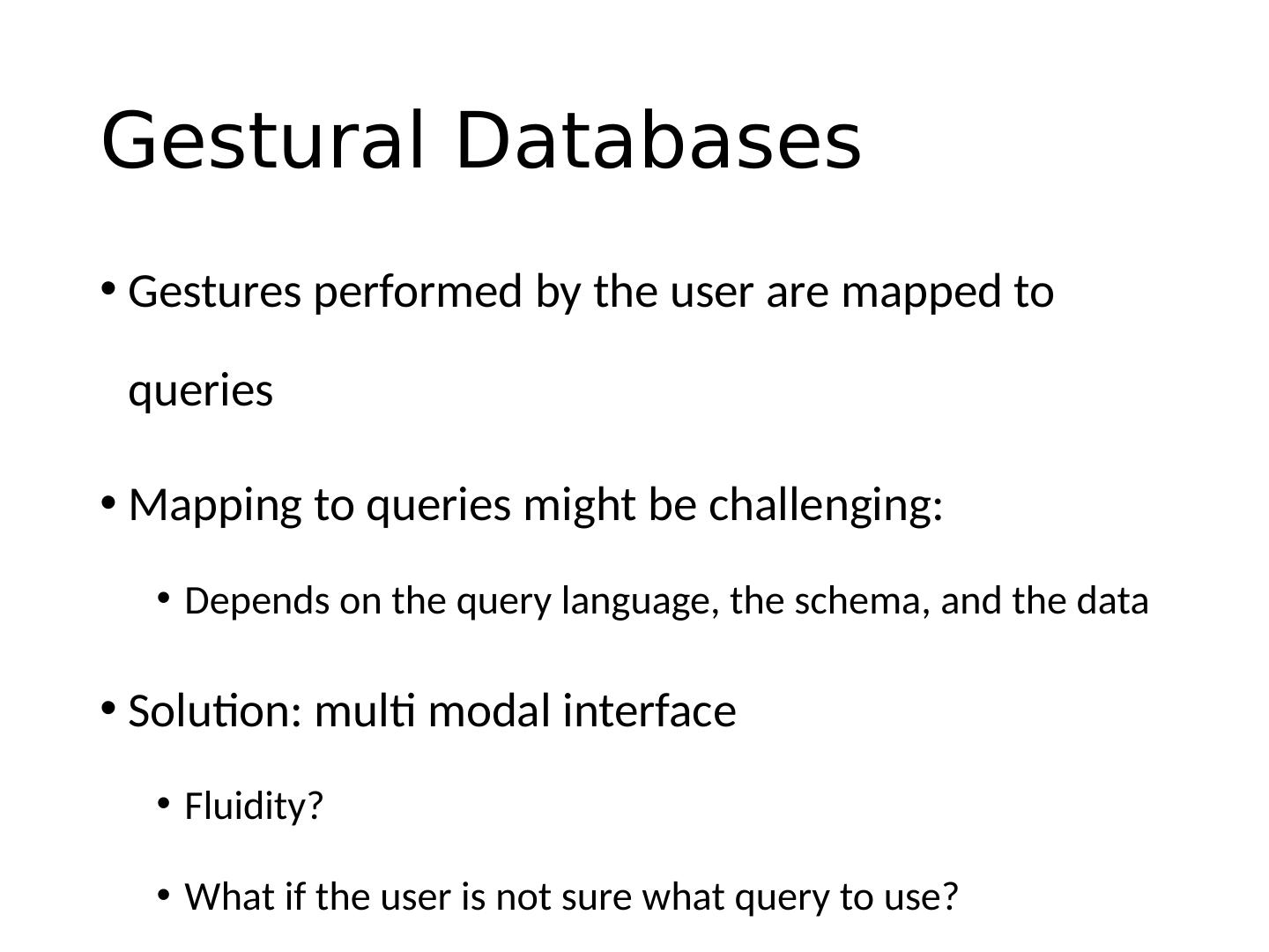 3 .Gestural Databases G estures performed by the user are mapped to queries Mapping to queries might be challenging: Depends on the query language, the schema, and the data Solution: multi modal interface Fluidity? What if the user is not sure what query to use?