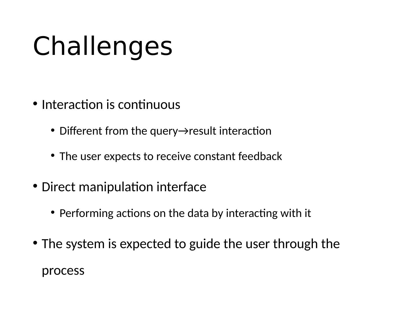 5 .Challenges Interaction is continuous Different from the query→result interaction The user expects to receive constant feedback Direct manipulation interface Performing actions on the data by interacting with it The system is expected to guide the user through the process