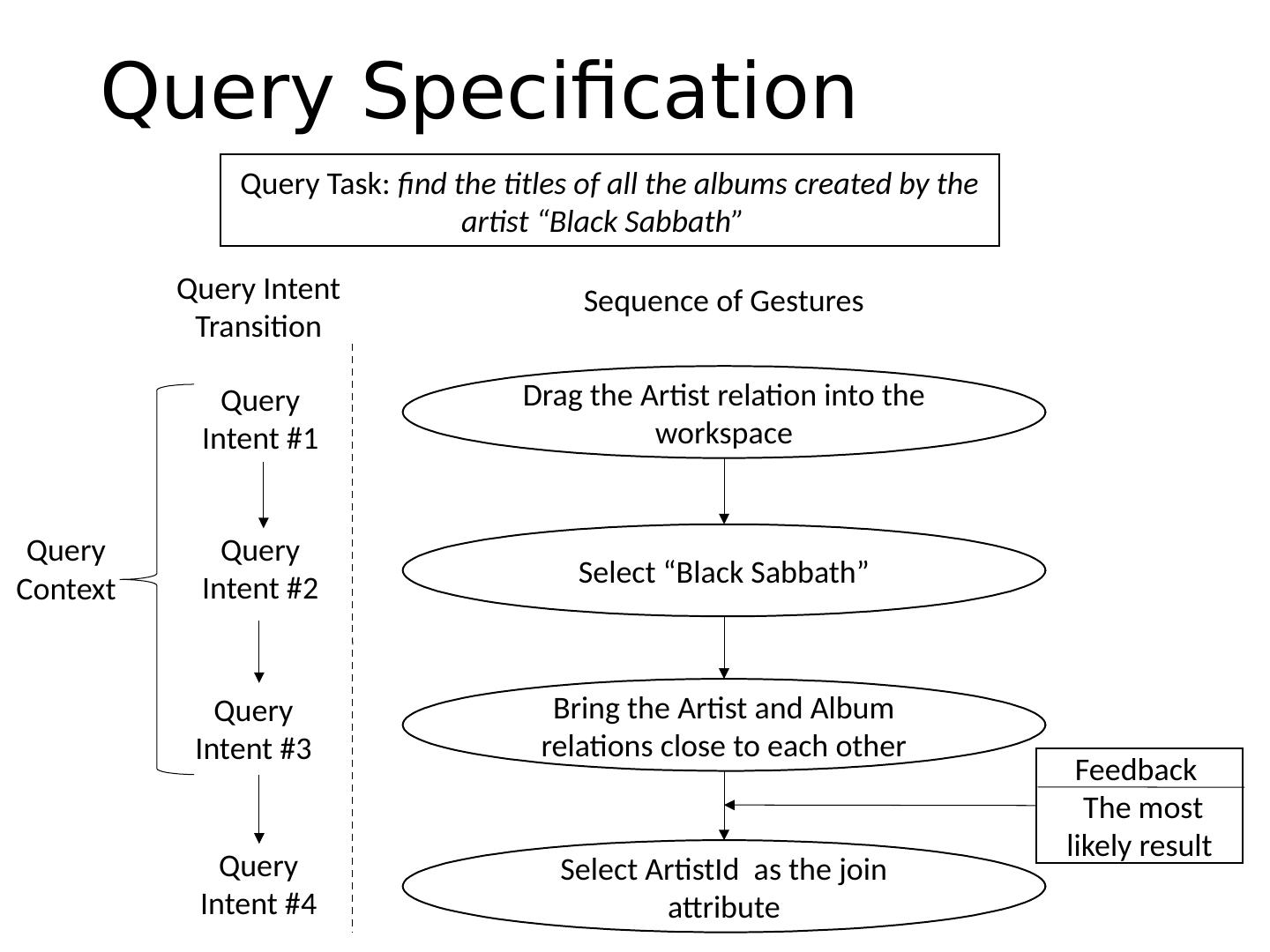 6 .Query Specification Query Task: find the titles of all the albums created by the artist “Black Sabbath” ” Query C ontext D rag the Artist relation into the workspace Select “Black Sabbath” Bring the Artist and Album relations close to each other Select ArtistId as the join attribute Feedback The most likely result Query Intent #1 Query Intent #2 Query Intent #3 Query Intent #4 Query Intent Transition Sequence of Gestures