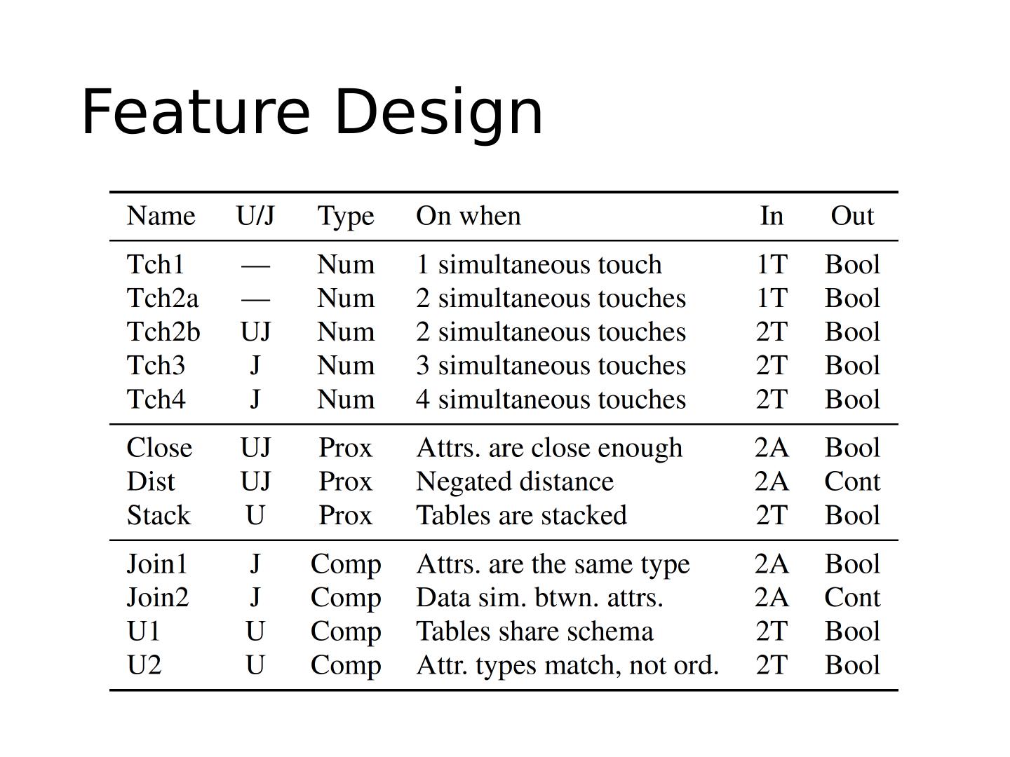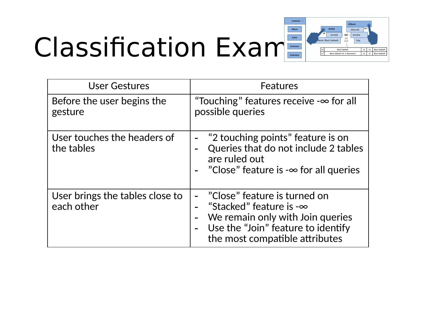 16 .Classification Example User Gestures Features Before the user begins the gesture “Touching” features receive -∞ for all possible queries User touches the headers of the tables “2 touching points” feature is on Queries that do not include 2 tables are ruled out ”Close” feature is - ∞ for all queries User brings the tables close to each other ”Close” feature is turned on “Stacked” feature is - ∞ We remain only with Join queries Use the “Join” feature to identify the most compatible attributes