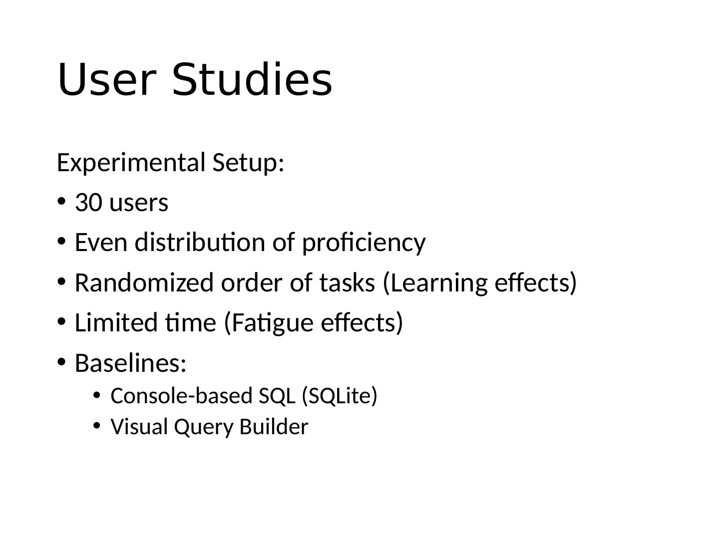 17 .User Studies Experimental Setup: 30 users Even distribution of proficiency Randomized order of tasks (Learning effects) Limited time (Fatigue effects) Baselines: Console-based SQL (SQLite) Visual Query Builder