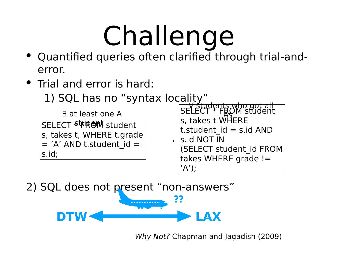 9 .Summary DataPlay: easier trial-and-error specification quantified queries. Nested universal table data model Syntax locality: Toggling of existential and universal quantifiers. “Tweaks” to queries could be done through graphical manipulation of query tree. Lack of non-answers: Query correction via examination and selection of answers and non-answers examples.