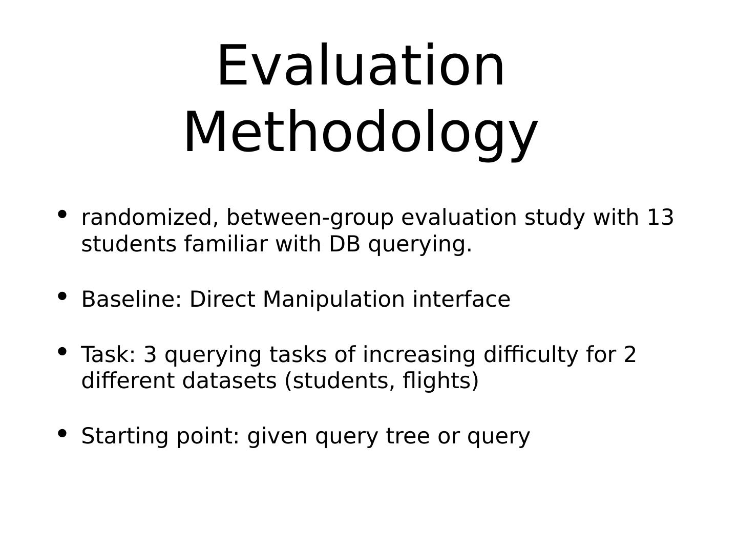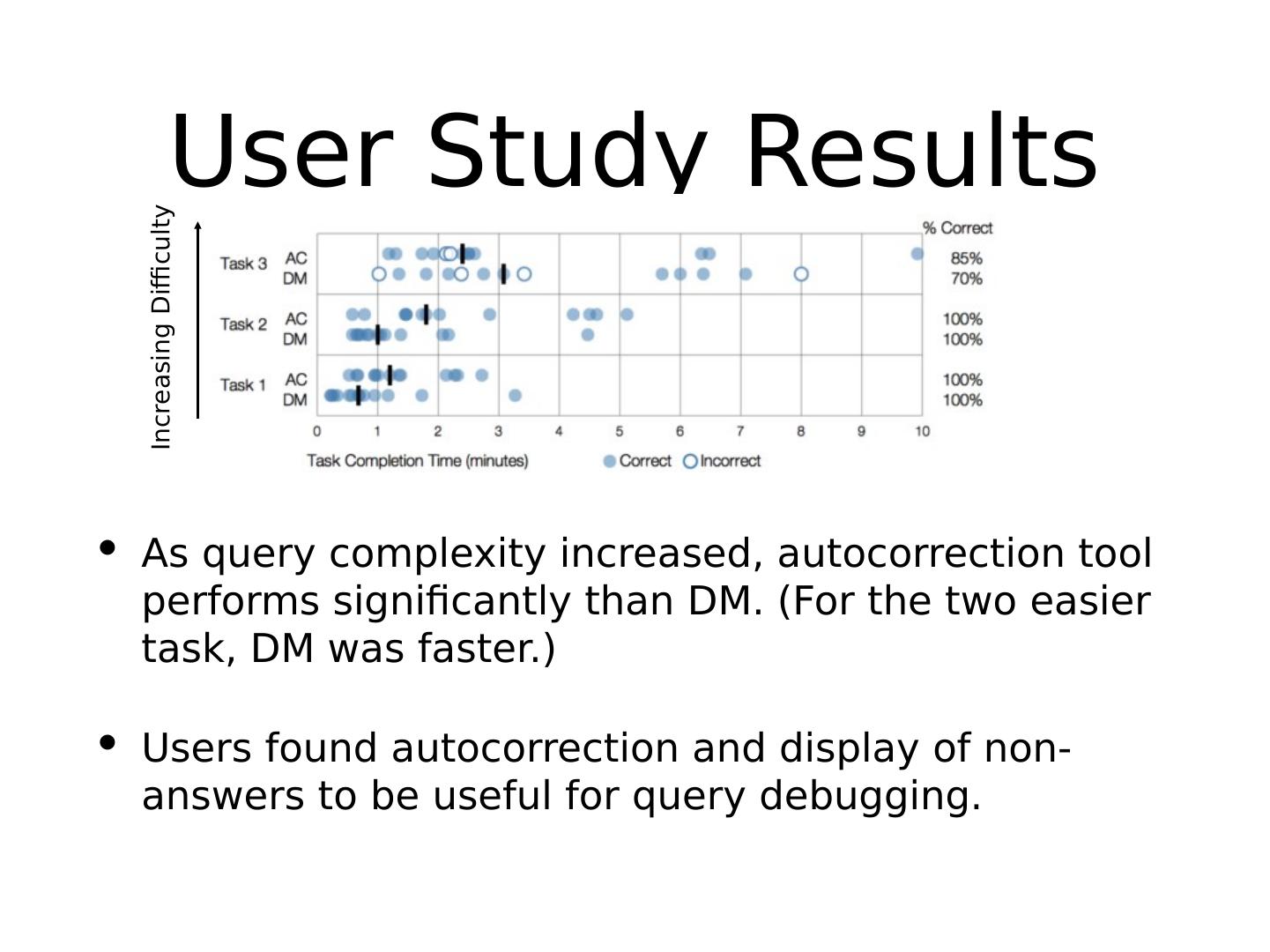6 .User Study Results As query complexity increased, autocorrection tool performs significantly than DM. (For the two easier task, DM was faster.) Users found autocorrection and display of non-answers to be useful for query debugging. Increasing Difficulty