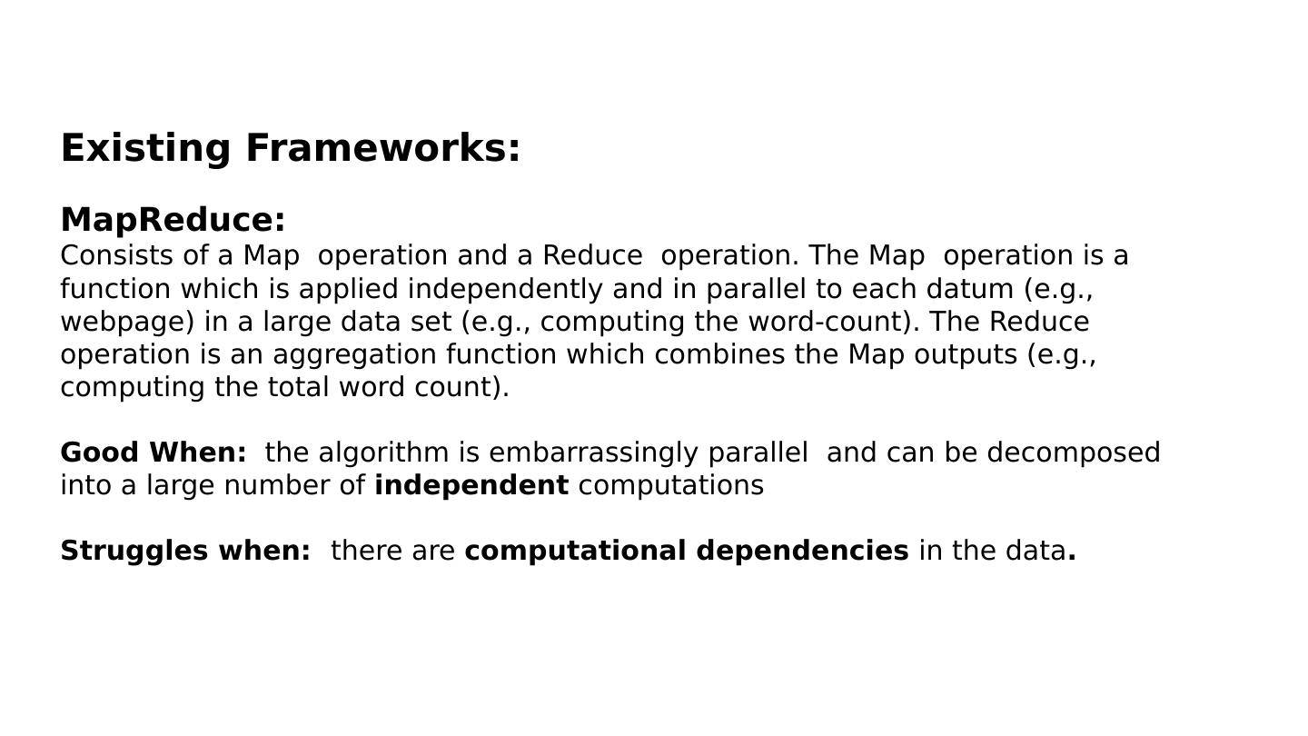 4 .Existing Frameworks: MapReduce : Consists of a Map operation and a Reduce operation. The Map operation is a function which is applied independently and in parallel to each datum (e.g., webpage) in a large data set (e.g., computing the word-count). The Reduce operation is an aggregation function which combines the Map outputs (e.g., computing the total word count ). Good When: the algorithm is embarrassingly parallel and can be decomposed into a large number of independent computations Struggles when: there are computational dependencies in the data .