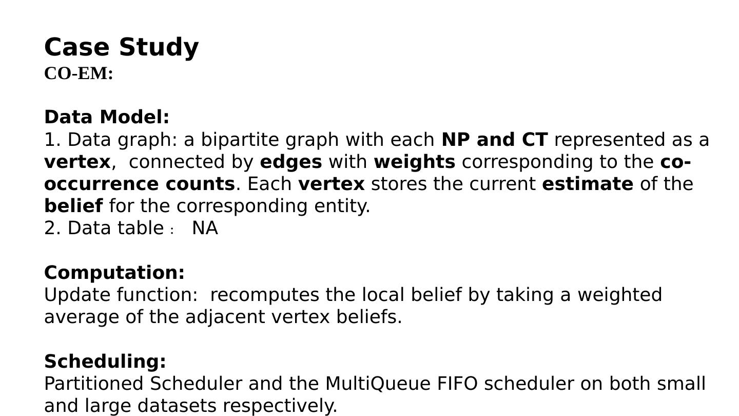 20 .Case Study CO-EM: Data Model: 1. Data graph: a bipartite graph with each NP and CT represented as a vertex , connected by edges with weights corresponding to the co-occurrence counts . Each vertex stores the current estimate of the belief for the corresponding entity. 2. Data table:NA Computation: Update function: recomputes the local belief by taking a weighted average of the adjacent vertex beliefs. Scheduling: Partitioned Scheduler and the MultiQueue FIFO scheduler on both small and large datasets respectively.