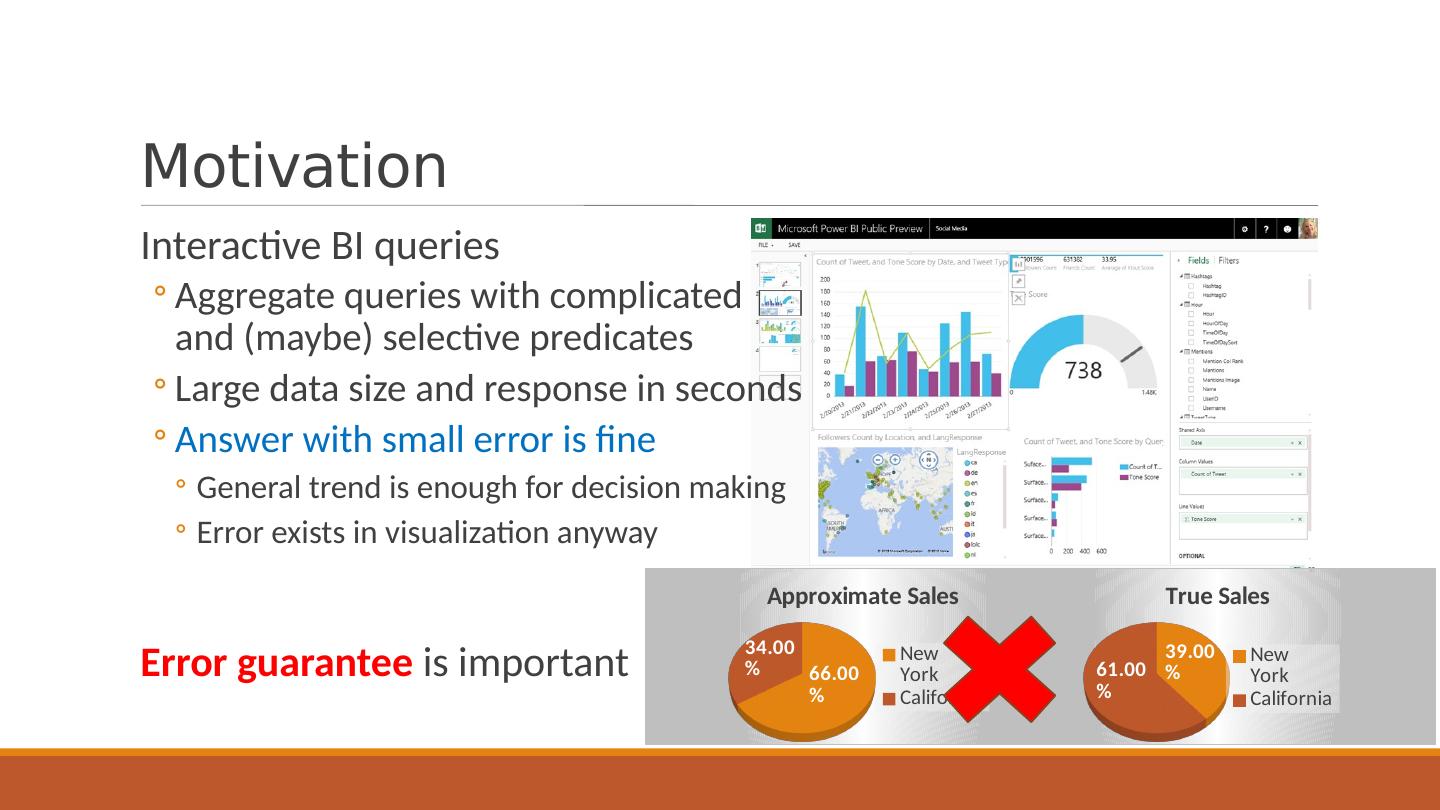 4 .Motivation Interactive BI queries Aggregate queries with complicated and (maybe) selective predicates Large data size and response in seconds Answer with small error is fine General trend is enough for decision making Error exists in visualization anyway Error guarantee is important