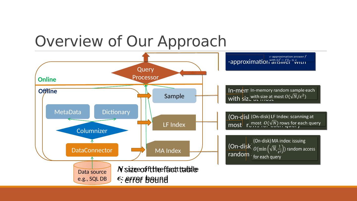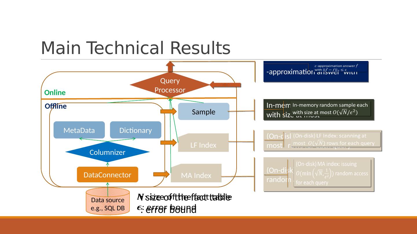 11 .Main Technical Results DataConnector Columnizer Sample LF Index MA Index MetaData Dictionary Query Processor Data source e.g., SQL DB (On-disk) LF Index: scanning at most rows for each query (On-disk) MA index: issuing random access for each query -approximation answer with Online Offline In-memory random sample each with size at most : size of the fact table : error bound