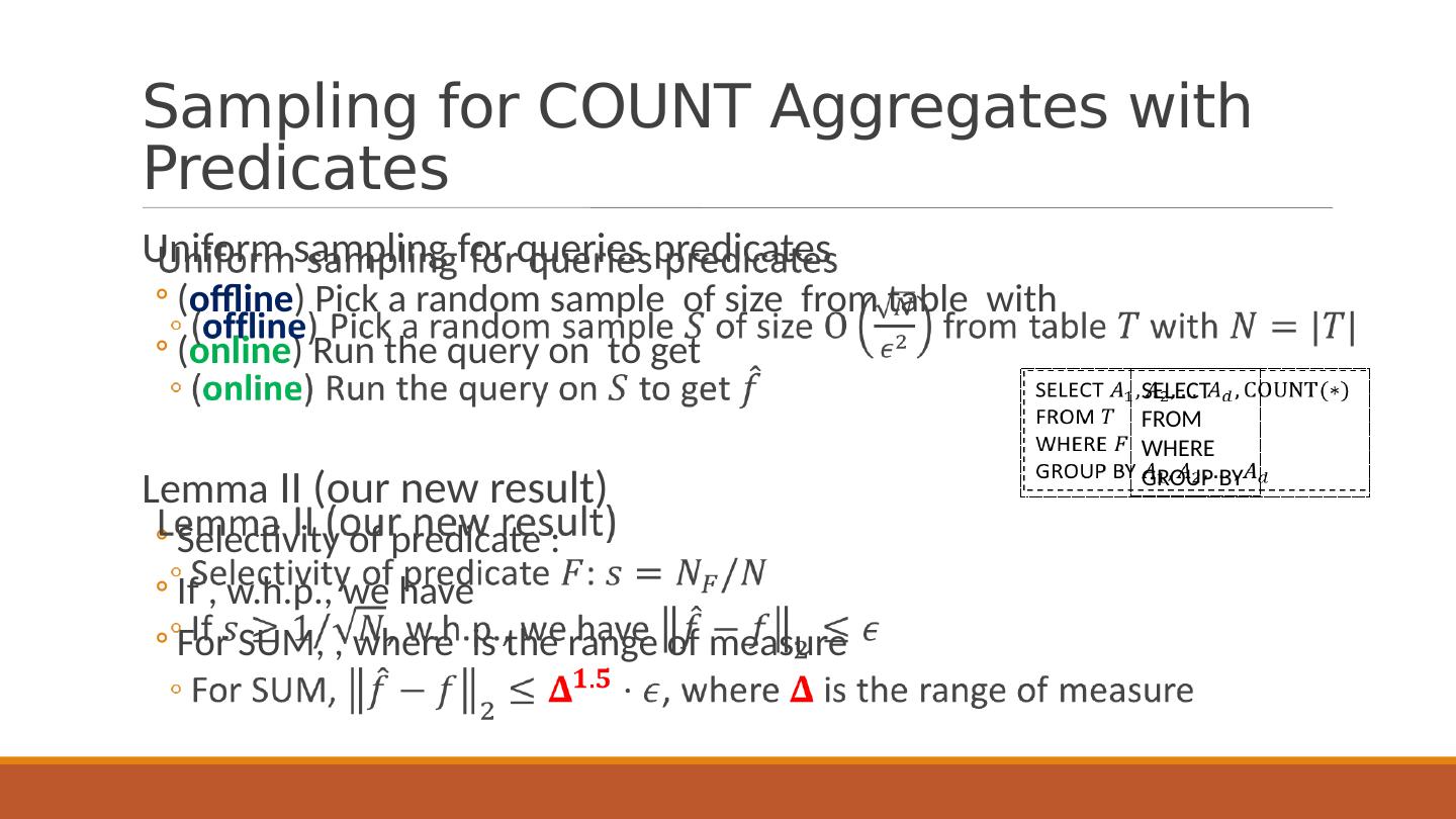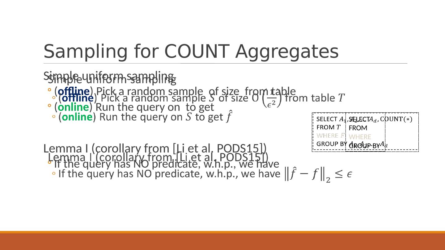 12 .Sampling for COUNT Aggregates Simple uniform sampling ( offline ) Pick a random sample of size from table ( online ) Run the query on to get Lemma I (corollary from [Li et al. PODS15]) If the query has NO predicate, w.h.p ., we have SELECT FROM WHERE GROUP BY