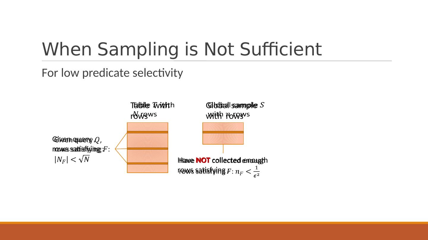 16 .When Sampling is Not Sufficient For low predicate selectivity Given query , rows satisfying : Table with rows Have NOT collected enough rows satisfying : Global sample with rows